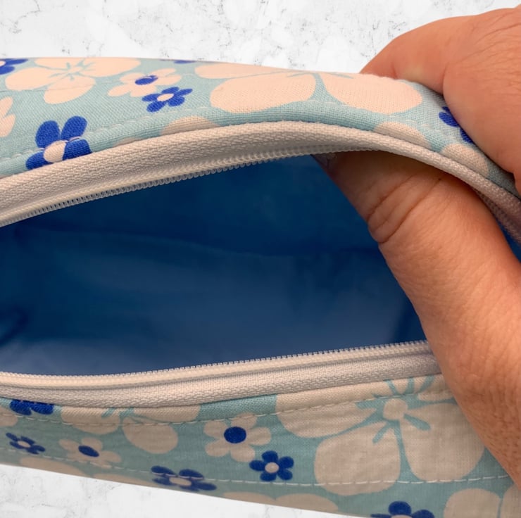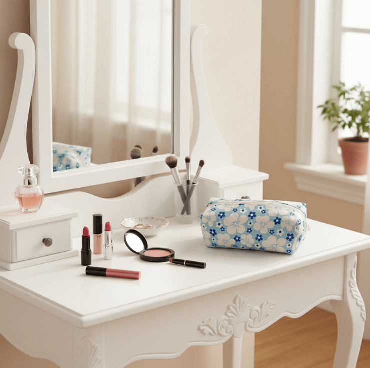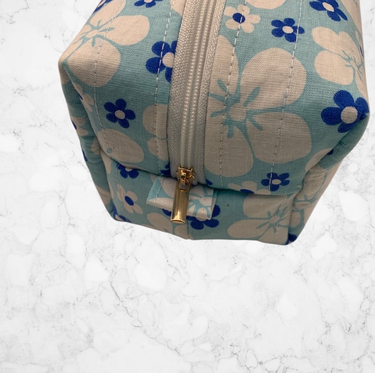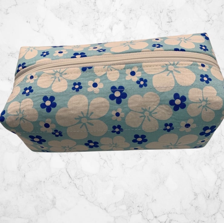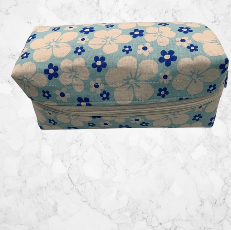 Small boxed make up pouch for storage or travel. Quite spacious but smaller than the large version which, holds toiletries.