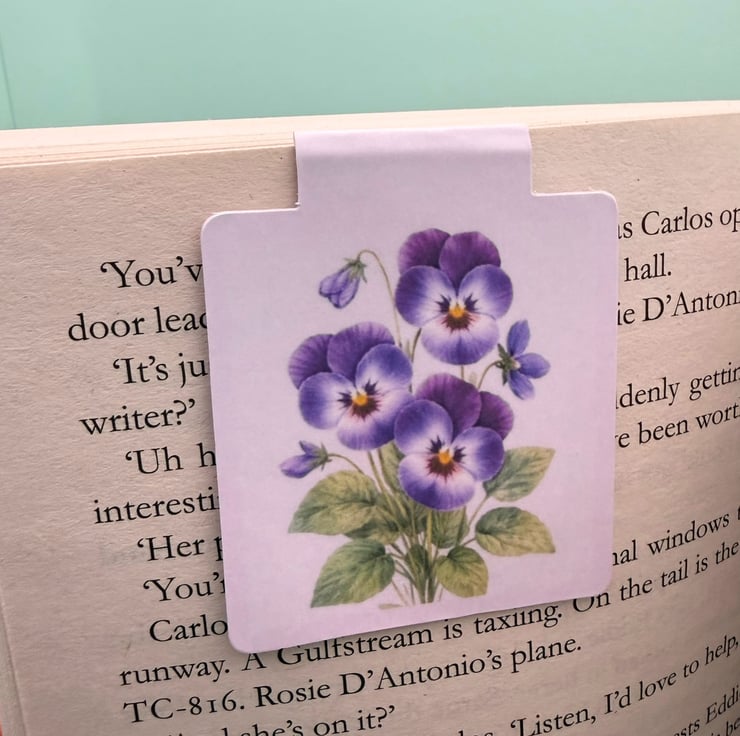 A delicate magnetic bookmark featuring a soft botanical illustration of the violet, designed to gently clip over your page without slipping.