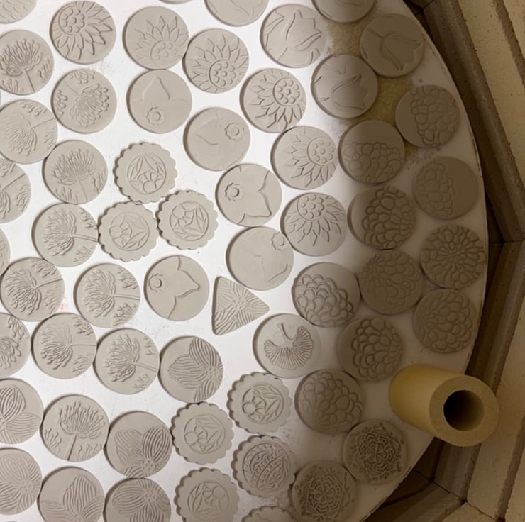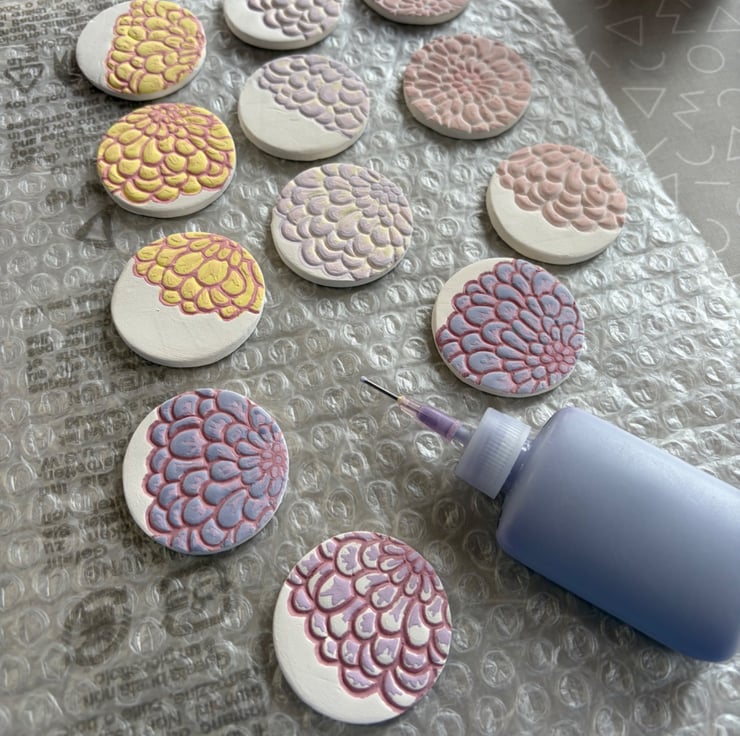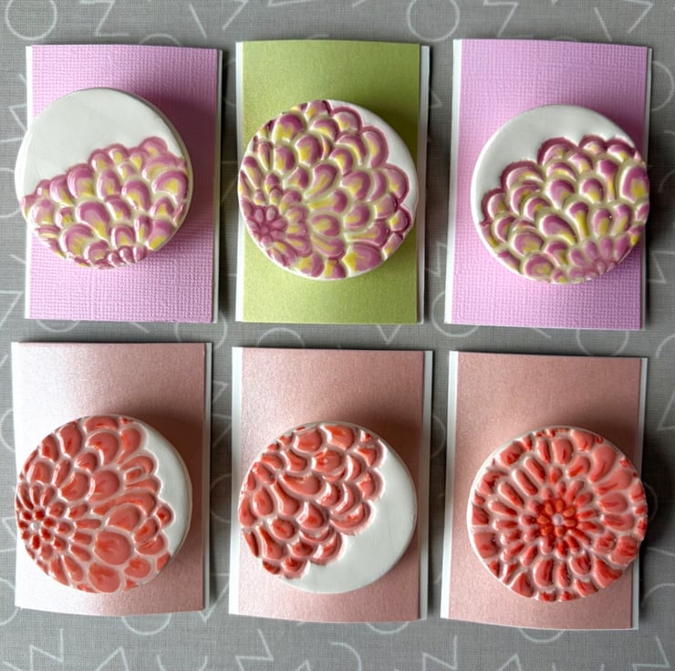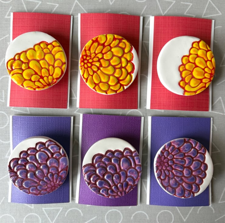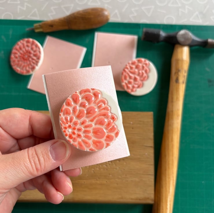 Next to the fun bit, applying colour! I hand paint each brooch using a combination of vibrant Dahlia coloured underglazes. Before dipping in a glossy transparent glaze and firing for the final time. A brooch pin is then attached to the reverse and ta-da it's ready to wear!
