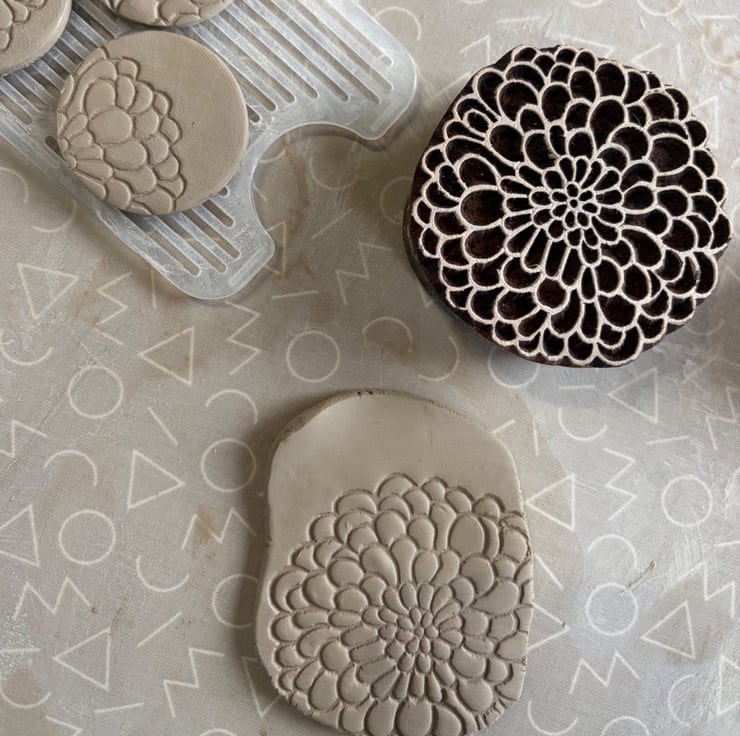 Made from white earthenware clay, these textured brooches are handmade from start to finish. Initially texture is applied to the surface of the clay using a decorative wooden block with a Dahlia design. Each piece is then air dried for several days before being kiln fired to form bisqueware.