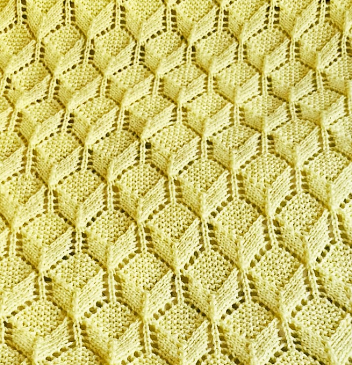 The pattern is seen in a diamond shape which is made up of stocking stitch and garter stitch and as is seen in the close up photographs, has a slight 3D look