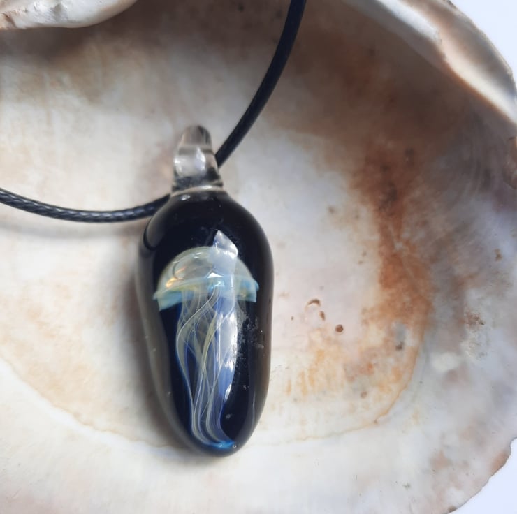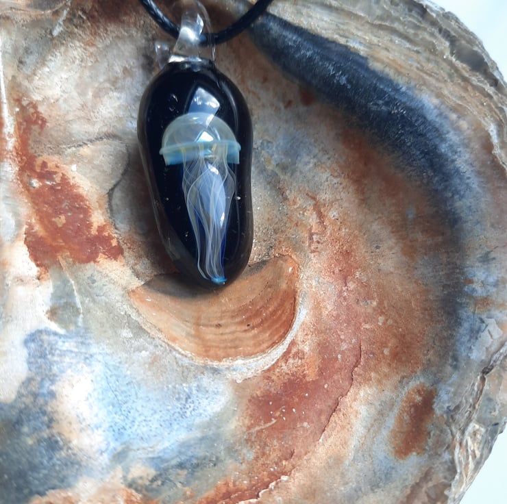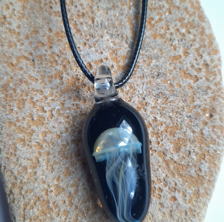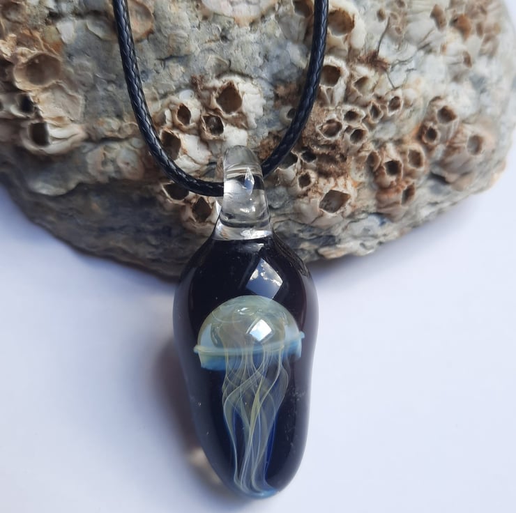 A beautiful glass pendant featuring a detailed jellyfish motif encapsulated within a teardrop-shape piece of dark glass, This piece of wearable art is created using lamp working techniques,often with borosilicate glass to ensure durability and clarity, realistic internal jellyfish figure with trailing tentacles with a black background to make the internal pop. With an integrated loop for the necklace cord. This is a fashion accessory.