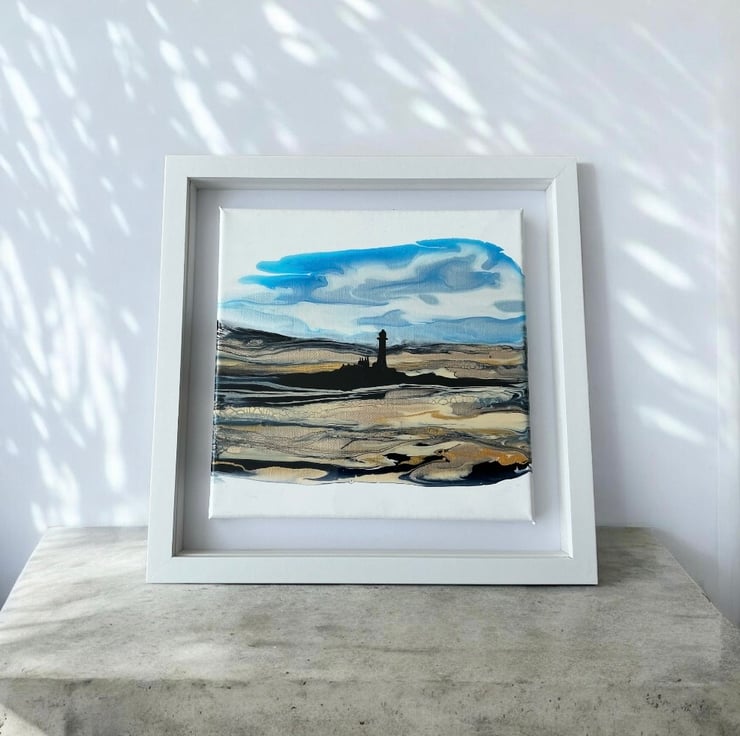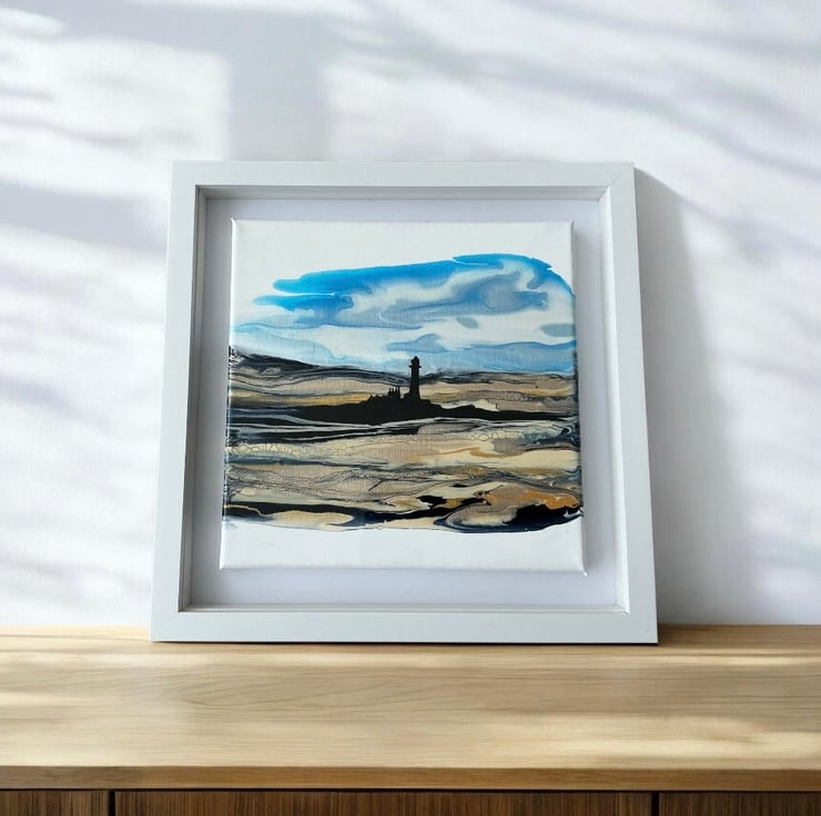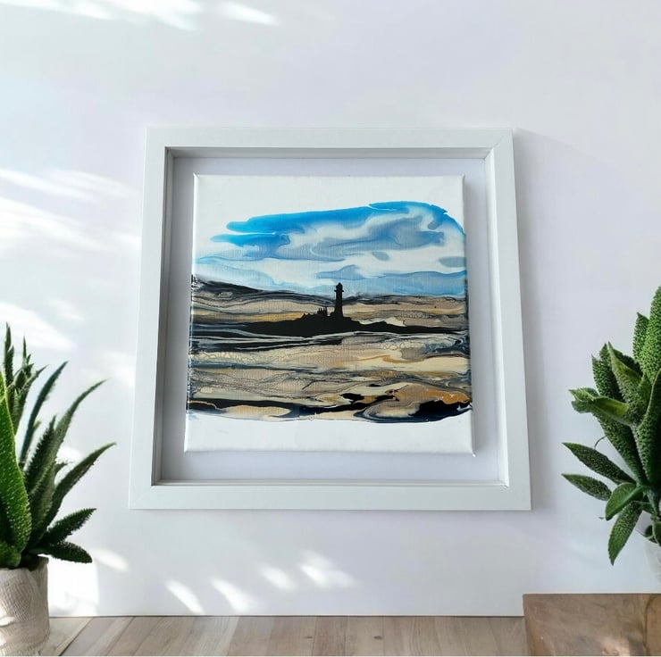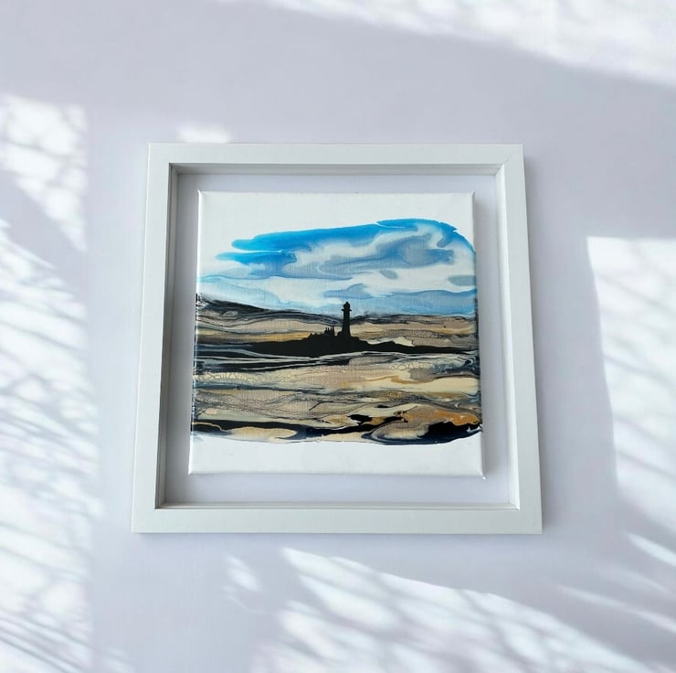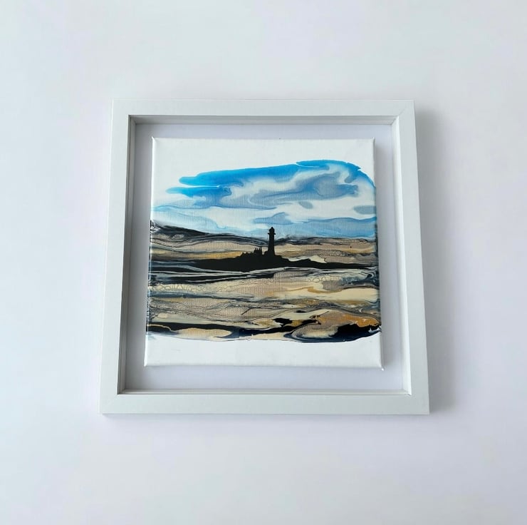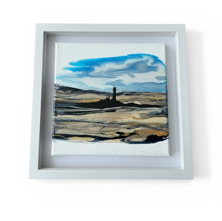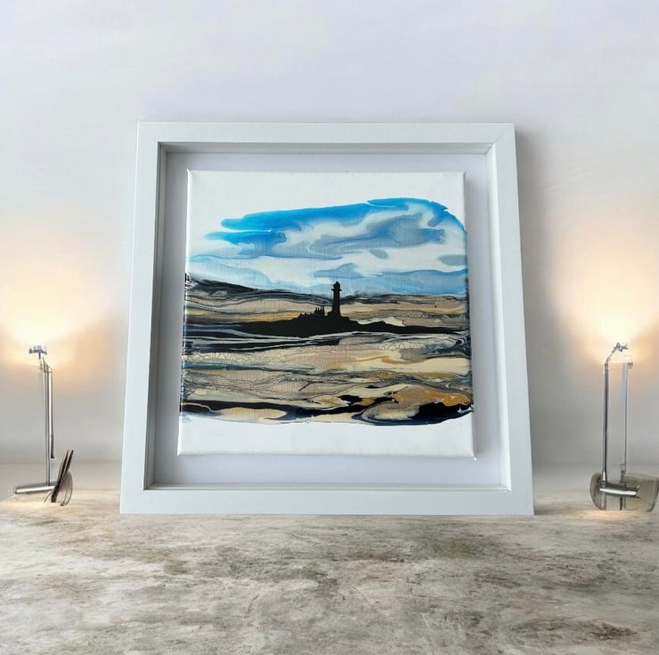 This is a beautiful shimmering painting of the Whitley bay lighthouse and sands in shimmering golds