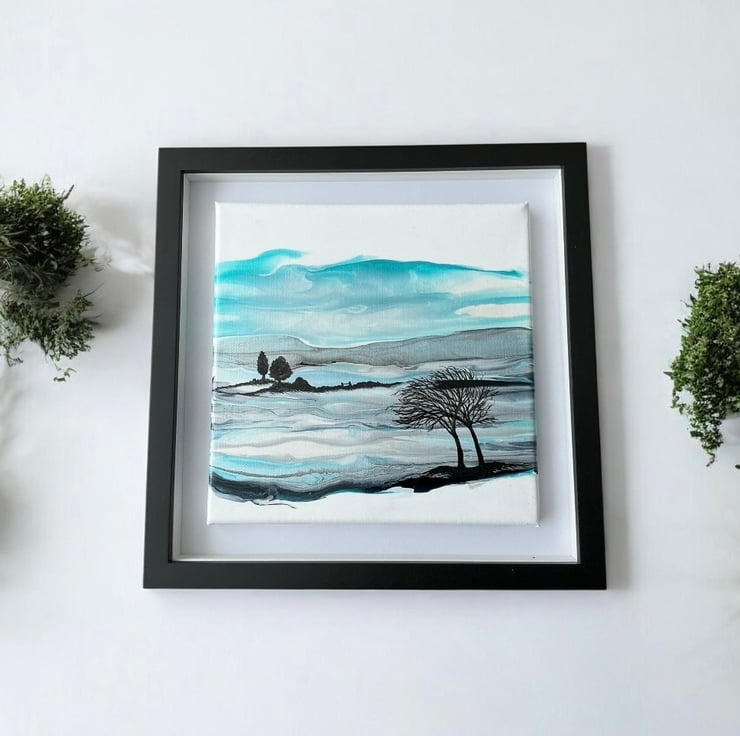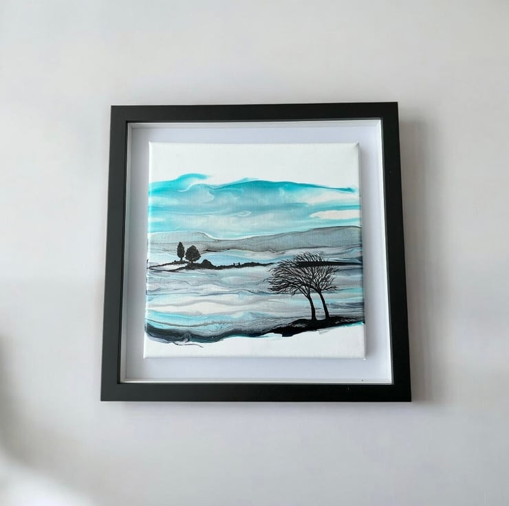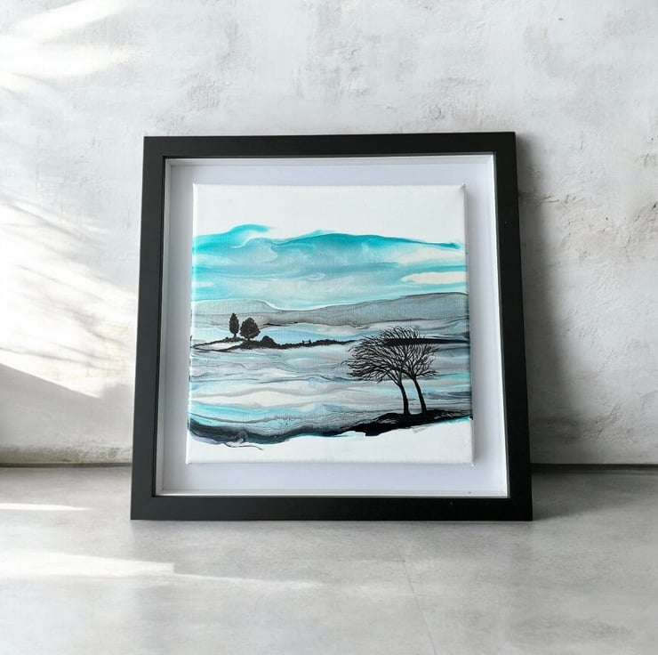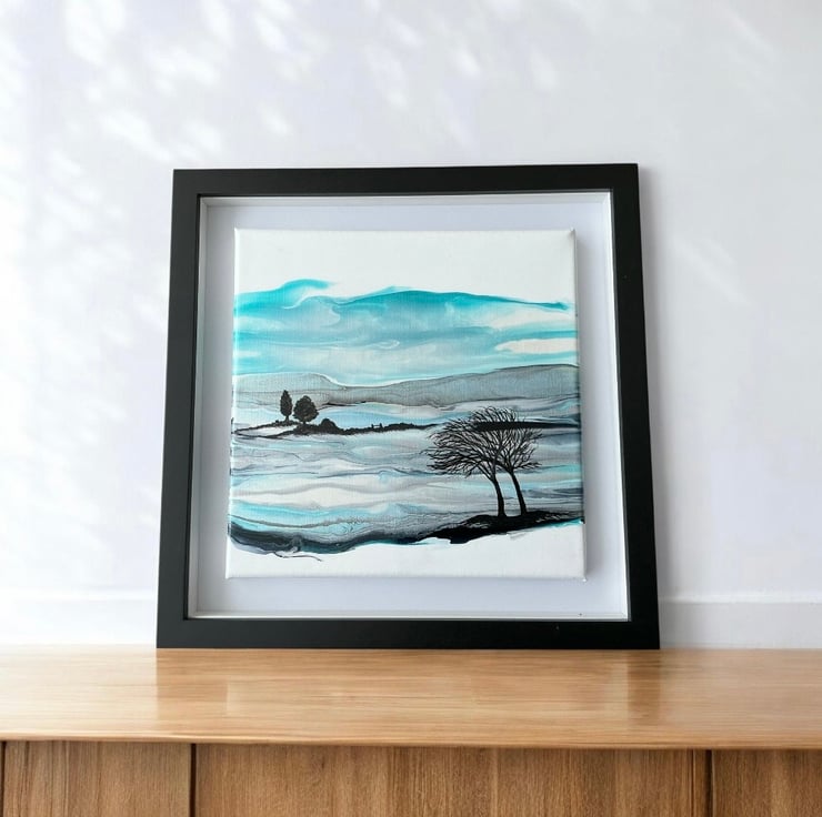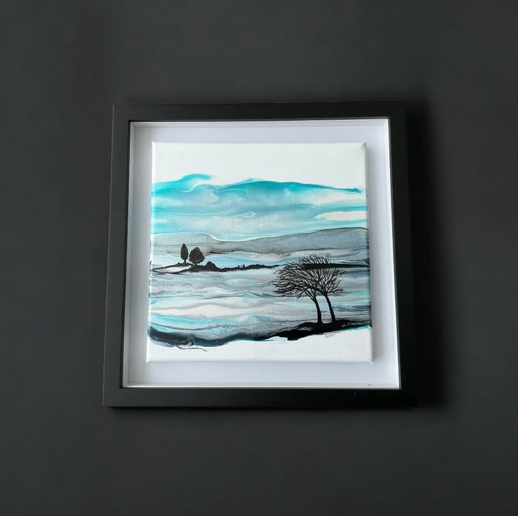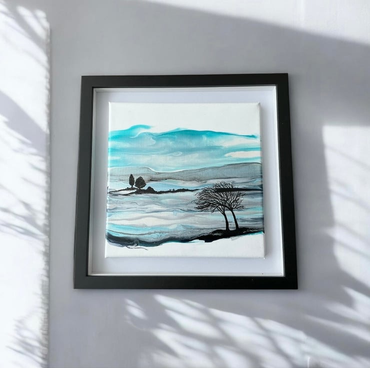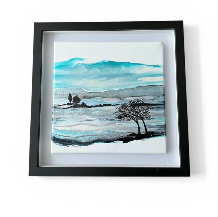 This is a beautiful shimmering painting of the Northumberland hills , icy in winters grip the blues in this picture are stunning and shimmer and shine in the light .