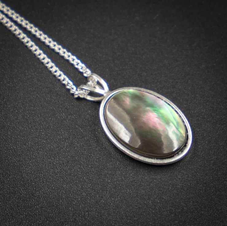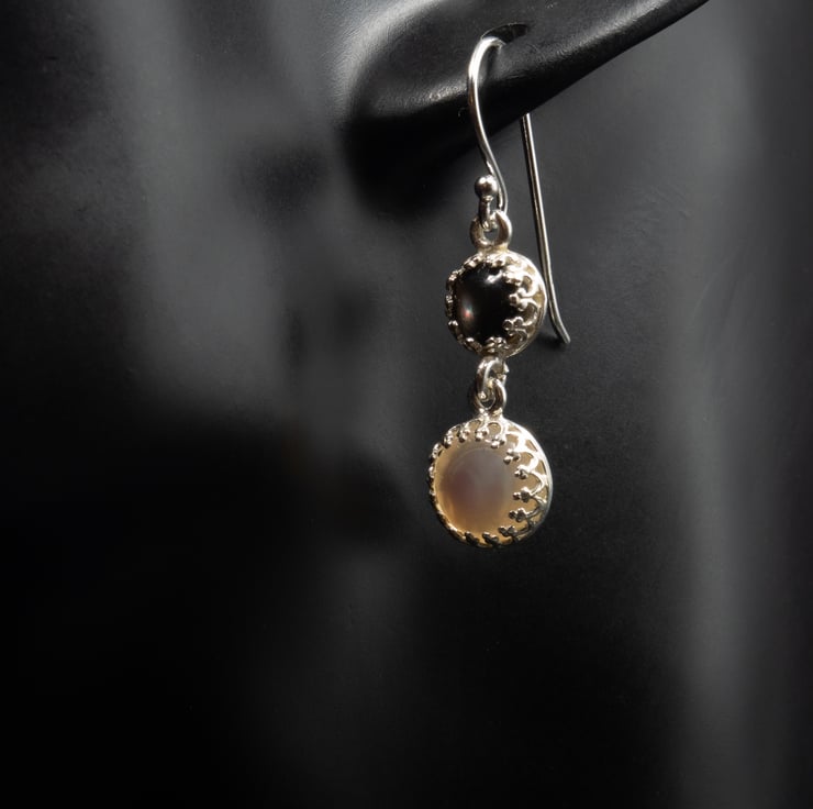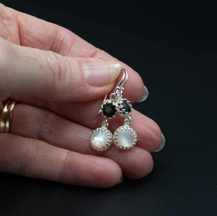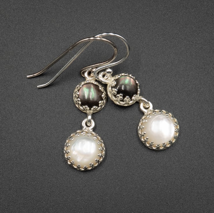 Glossy natural cream mother of pearl 8mm stones and 6mm black lip shell stones are set in silver plated crown design settings with open backs.