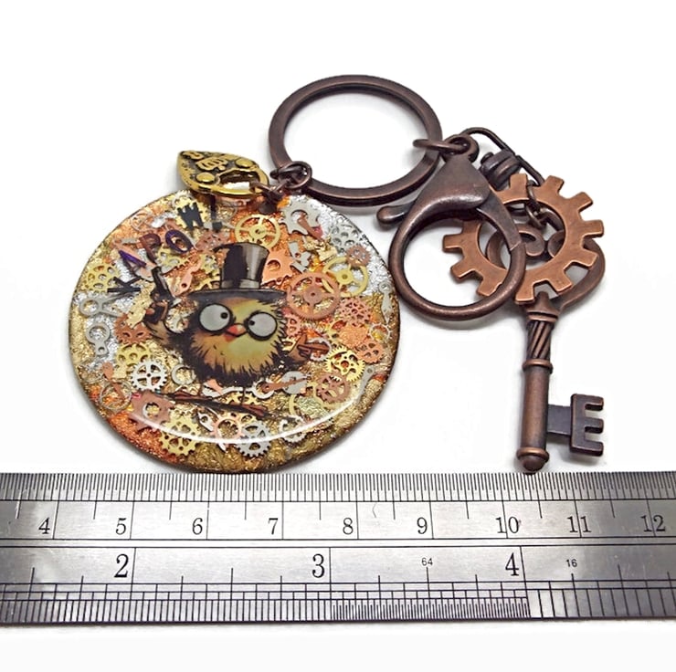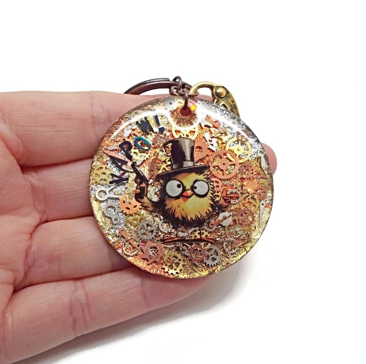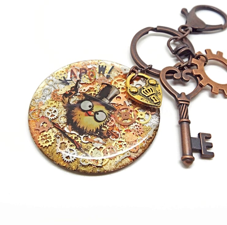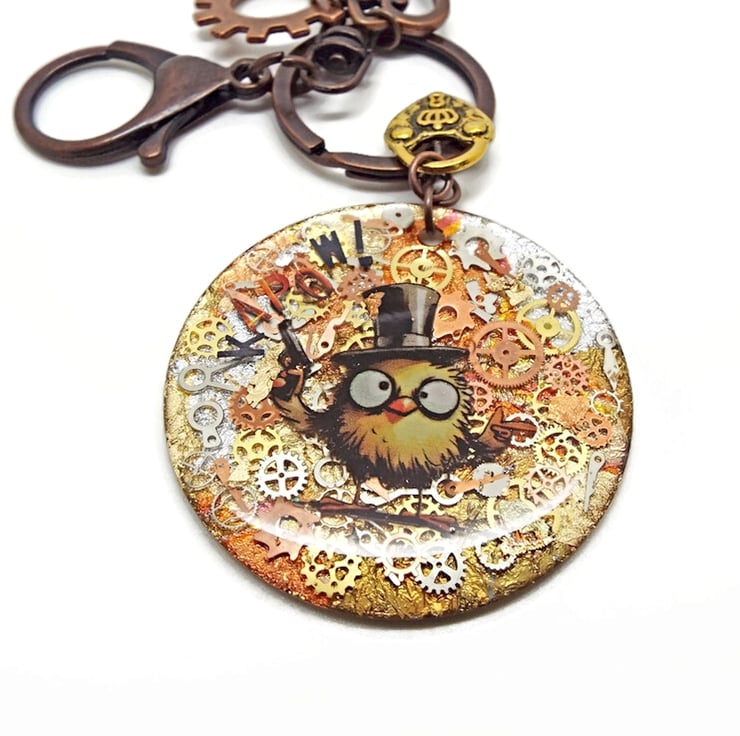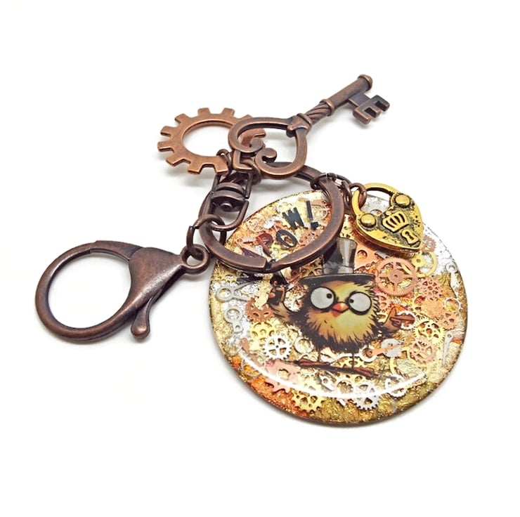 Steampunk Style Keyring or Bag Charm featuring a Top Hatted Bird
