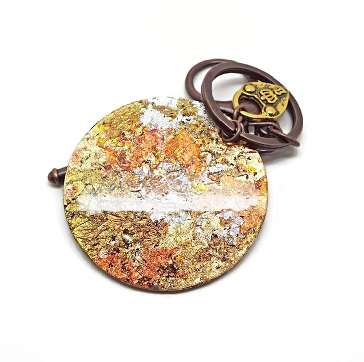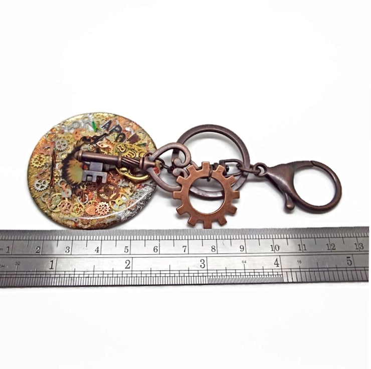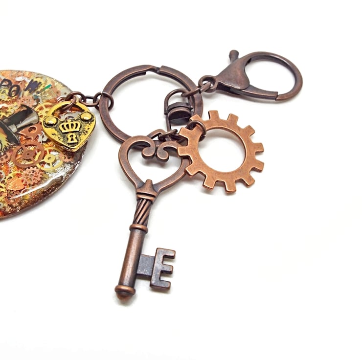 Fun Handmade Bag Charm Gift for a loved one. I've used a very dark Antique Red Copper Keyring to make this Bag Charm and added a Handmade Glitter and Resin Large Round Pendant as well as a Bright Copper Cog, Dark Red Copper Key and an Antique Gold Padlock. The pendant is crafted with several layers of resin and I have embedded Mini Watch Parts onto a Copper, Silver, Gold and Bronze Metal Leaf background.