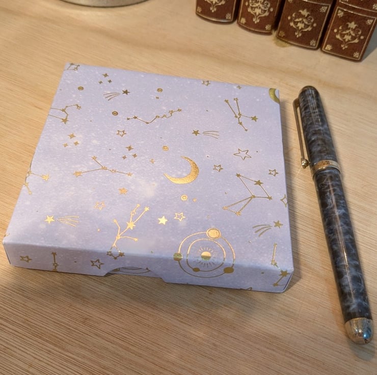 An ultra-thin, handmade gift box with separate lid, thin enough to be mailed via large letter post, featuring paper from the Violet Studios 'Cosmic Dreamer' series of beautiful decorative papers.