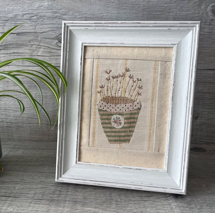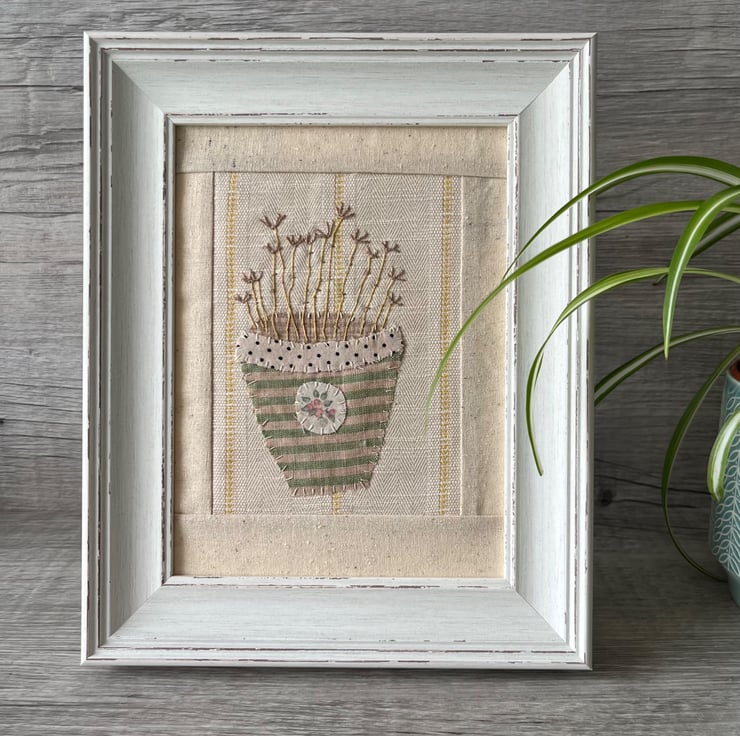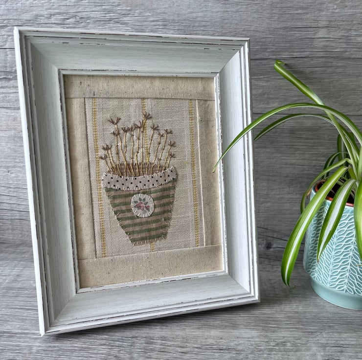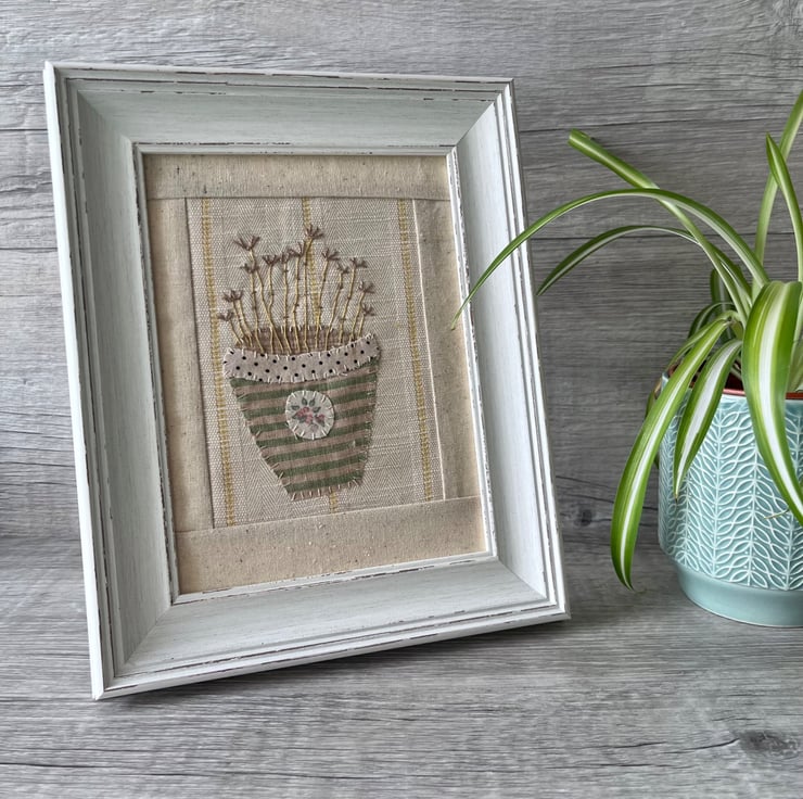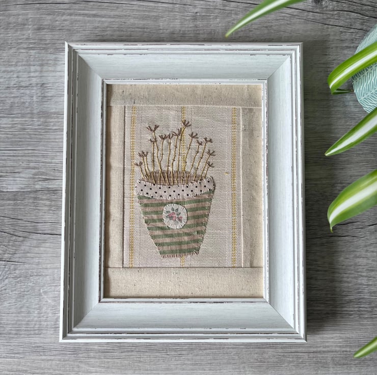 The picture features a pot with embroidered stems and seedheads. It has been hand embroidered and has a rustic, aged feel to it, partly due to the tea dyed fabrics. It would look great in any room of the house!