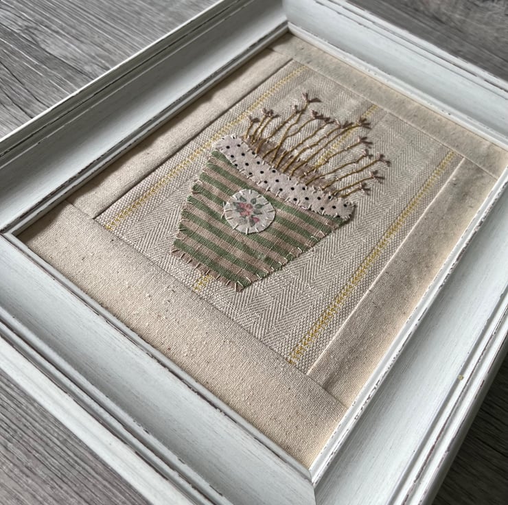 The chunky wooden frame is distressed, measures approximately 22cm x 27cm and perfectly shows off the pot. It can be hung or be free standing. Please note, to allow the textures of the fabrics and embroidery to be seen, there is no glass in the frame.