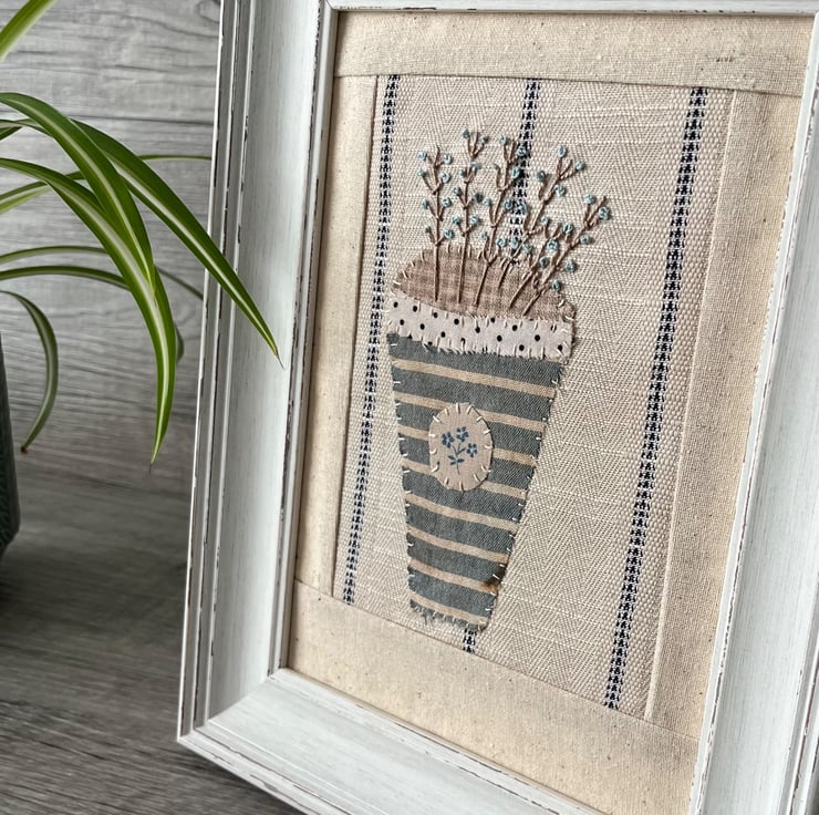 The picture features a pot with embroidered stems and seedheads. It has been hand embroidered and has a rustic, aged feel to it, partly due to the tea dyed fabrics. It would look great in any room of the house.