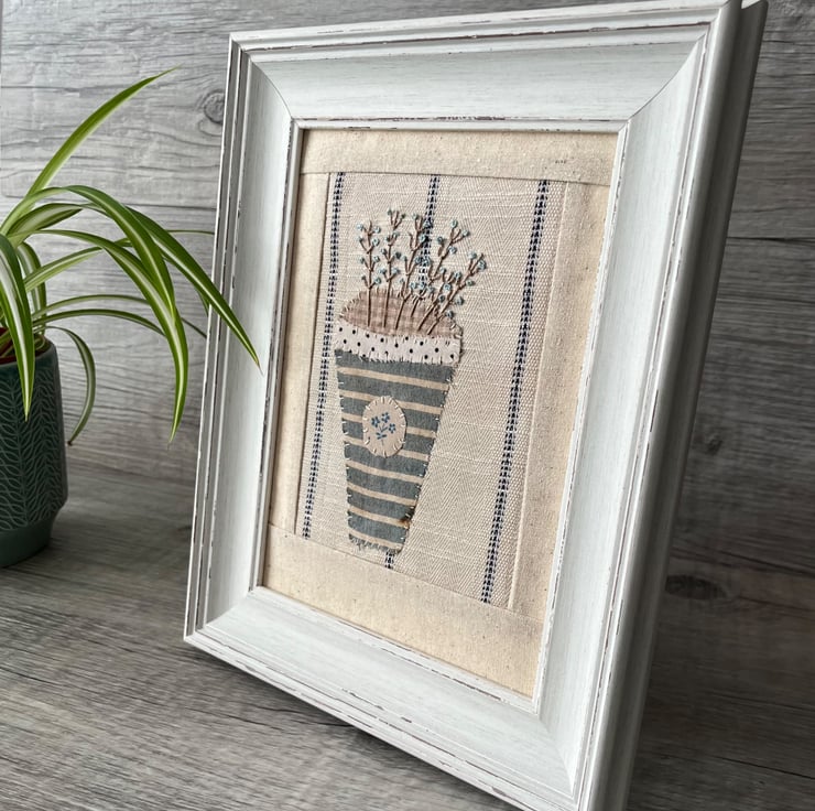 The chunky wooden frame is distressed, measures approximately 22cm x 27cm and perfectly shows off the pot. It can be hung or be free standing. Please note, to allow the textures of the fabrics and embroidery to be seen, there is no glass in the frame.