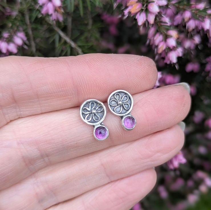 These handmade sterling silver shadowbox stud earrings feature a botanical flower design, set within a small circular frame. The recessed background has been gently oxidised to create contrast with the little silver flower. They are a stud fitting and have been handmade from recycled sterling silver.