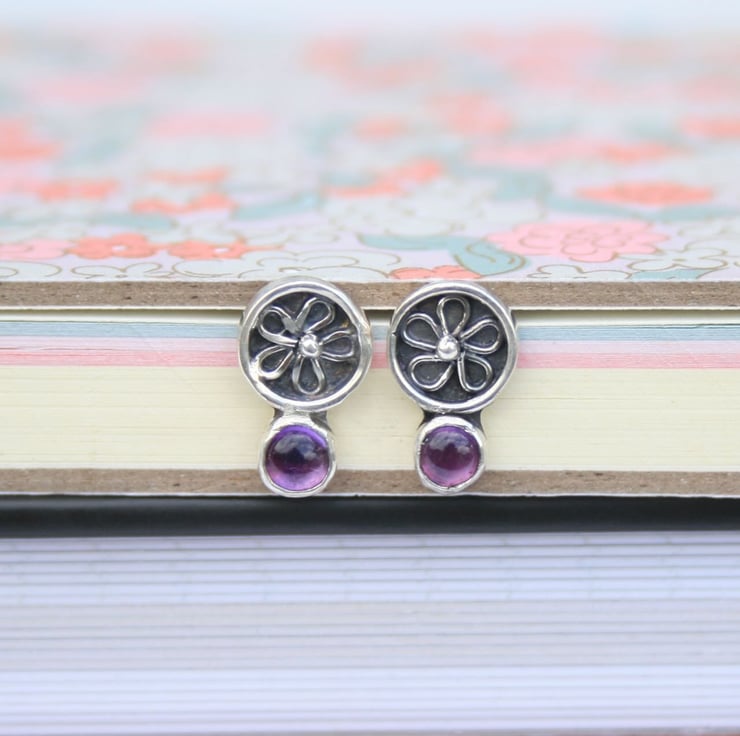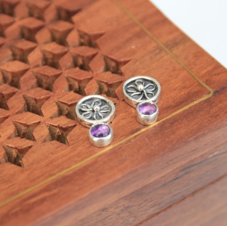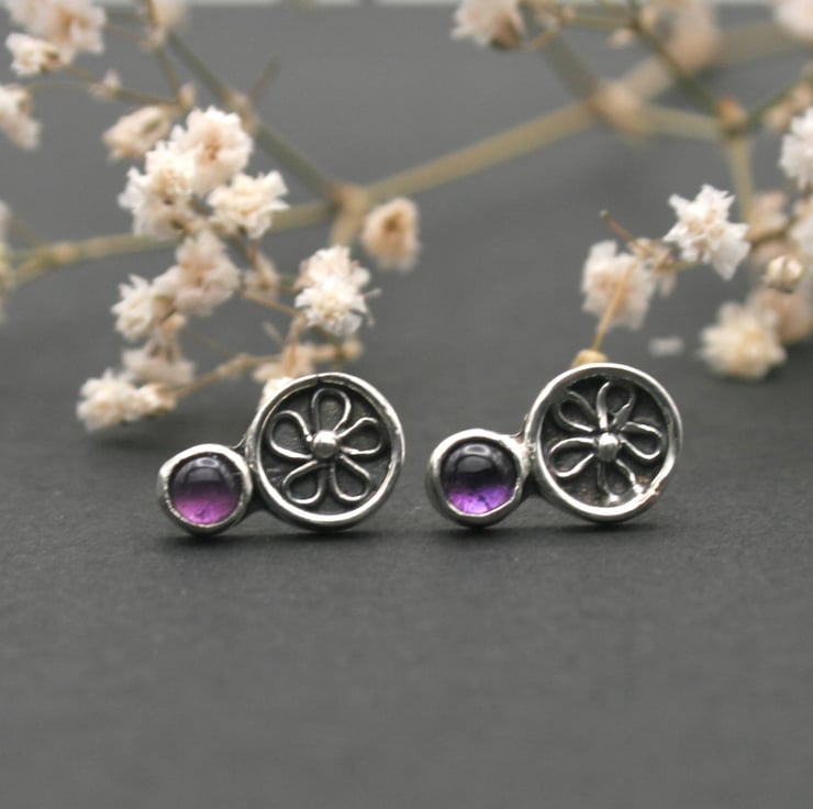 Suspended below each floral circle is a small bezel-set amethyst gemstone, adding a rich pop of purple. Their dainty size makes them ideal for everyday wear, while still offering a unique touch to an outfit.