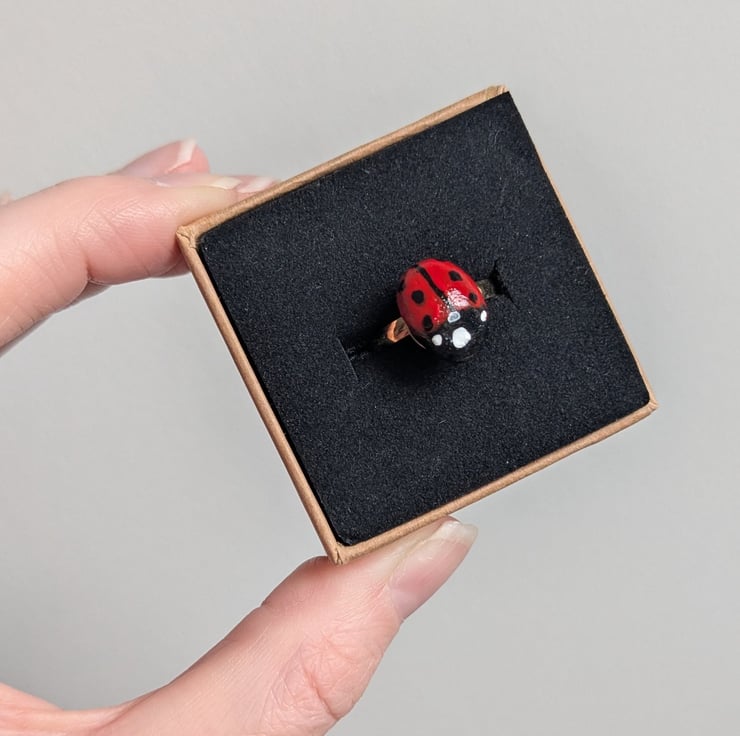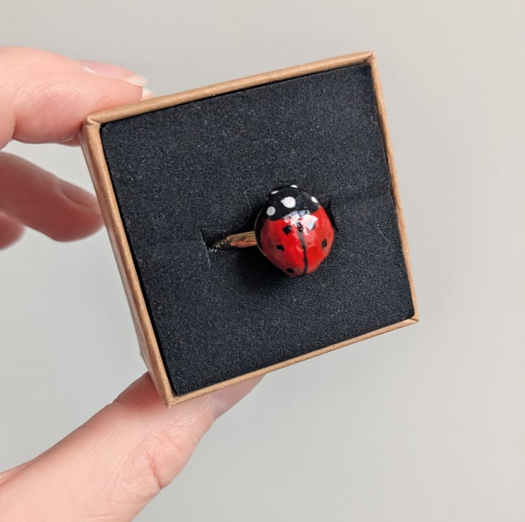 This adorable mini beast ring is handmade from air dry clay and hand painted with acrylic paint, it's set onto an adjustable gold style iron ring.