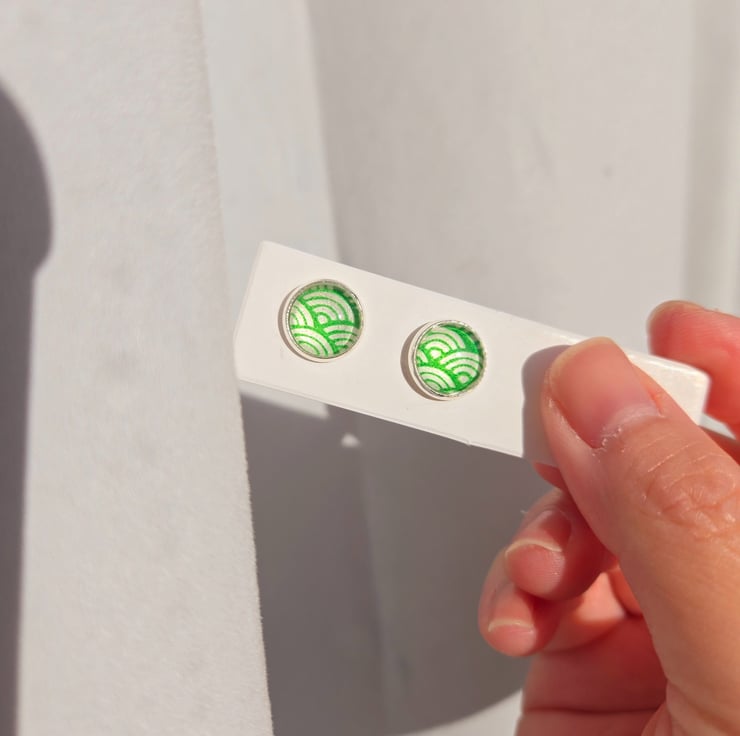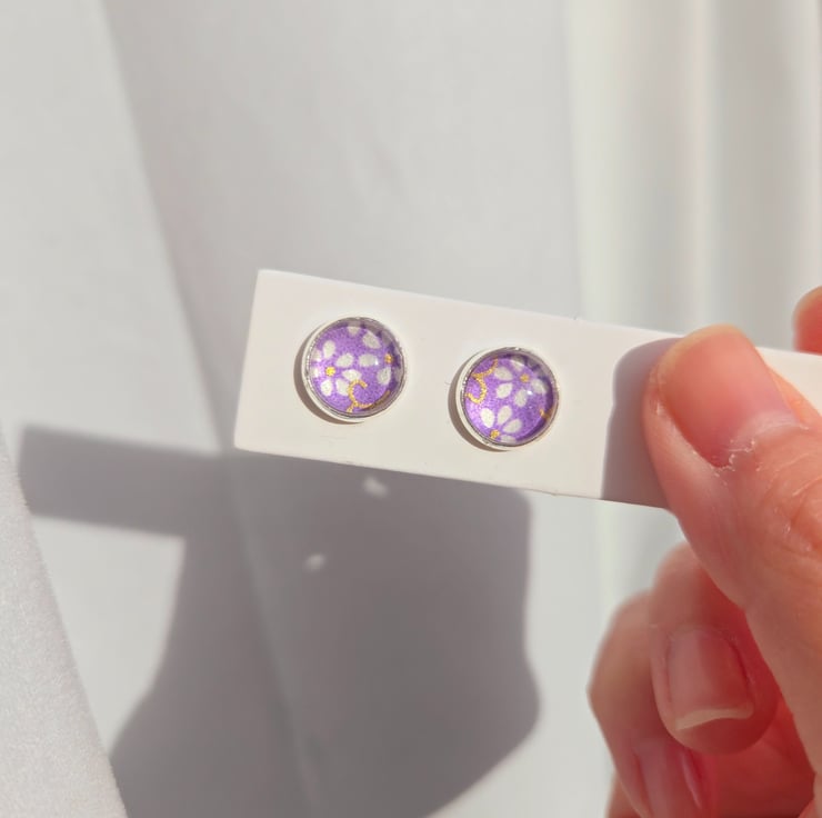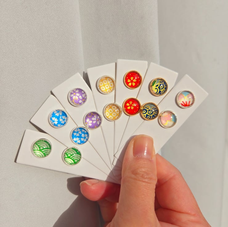These handmade Washi paper earrings are inspired by traditional Japanese patterns, made with high quality Japanese Washi paper, known for its vibrant colors and intricate textures, featuring delicate florals and geometric motifs in vibrant colours. Each piece is carefully crafted and sealed for durability, making them lightweight and comfortable for daily wear.