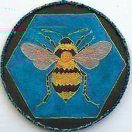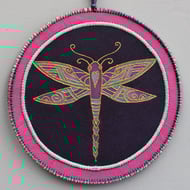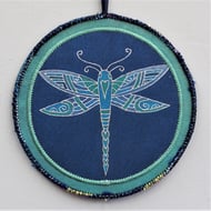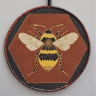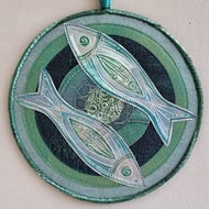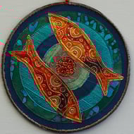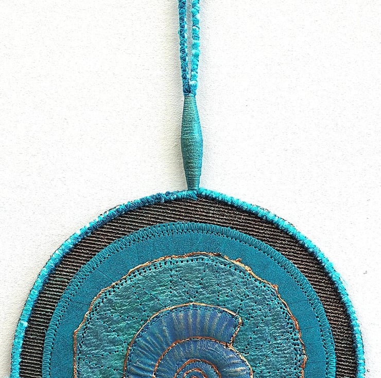 This hand painted fabric ammonite mandala measures 15cm (6") round. It is single sided and stiffened on the reverse (plain black) to hold it's shape. It comprises of handmade paper with a central design made of a material that has been embossed. Stitched onto painted fabrics with complimentary colour stitching and copper outlines to make it 'pop'. Mixed yarns are zig zagged on the outer edge and a hanging loop with a single, hand rolled and painted paper bead to finish it off on the top.