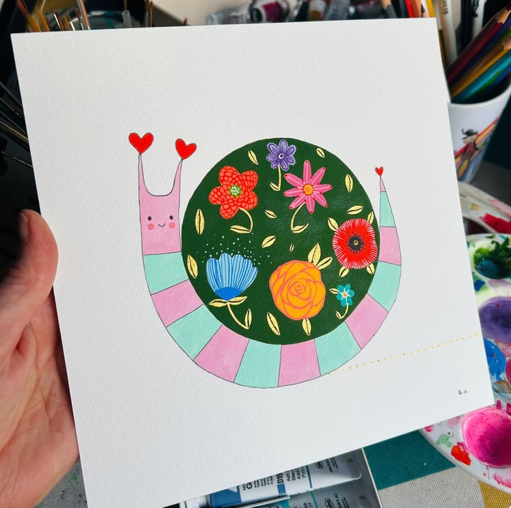 'Snail's Garden', an unframed original illustration measuring 20x20 cm, featuring a very floral snai,l painted using gouache and acrylic gouache, on 300gms watercolour paper. Originally inspired by some much smaller versions of this design, this is the only original in this size available . Perfect for a nursery or playroom .