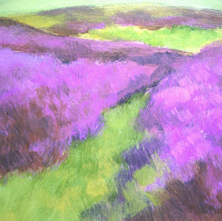 "Rambling Among the Heather" original acrylic landscape painting captures the serene beauty of a natural setting. This piece invites viewers to immerse themselves in the tranquil ambiance of a heather-filled landscape, evoking a sense of peace. The interplay of colours and textures is an invitation to explore the gentle undulations of the landscape, making it a perfect piece for those who appreciate the art of nature’s quiet elegance.With the vibrant hues and intricate brushwork, this painting offers a captivating glimpse into the untouched wilderness where the heather blooms in abundance.