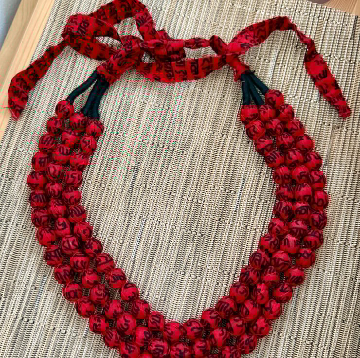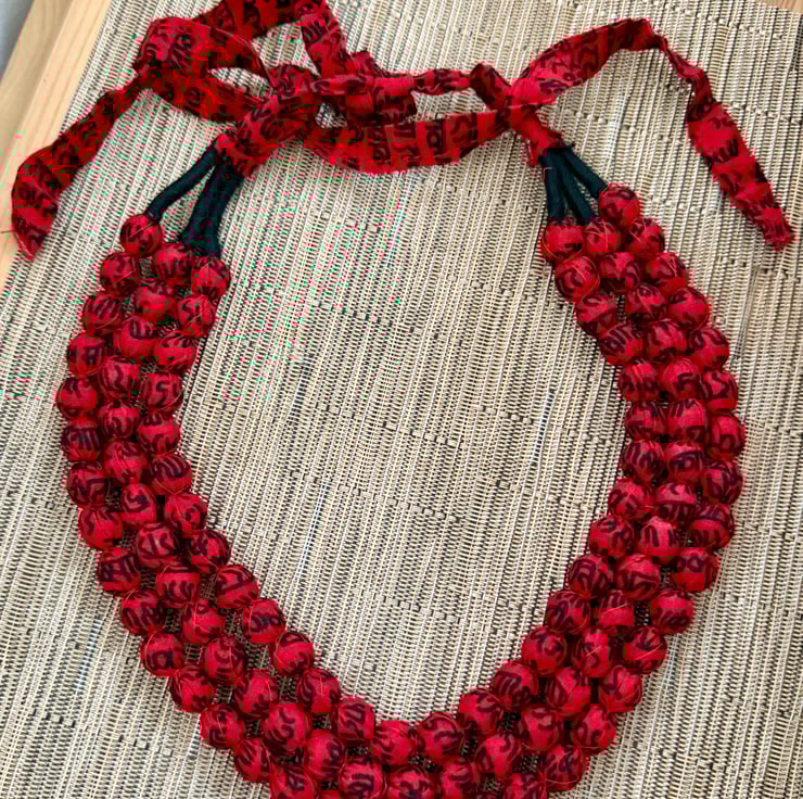 Add a pop of colour to your outfit with this beautiful handmade necklace featuring three strands of fabric- covered beads. Soft fabric tie makes it adjustable and comfortable to wear. Perfect for adding a touch of boho charm to any outfit.