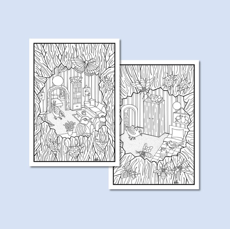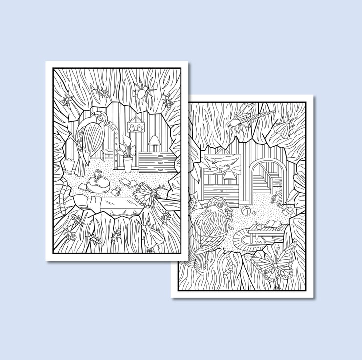 Printable art (digital) colouring pages of different bird tree houses, with various birds and insects.