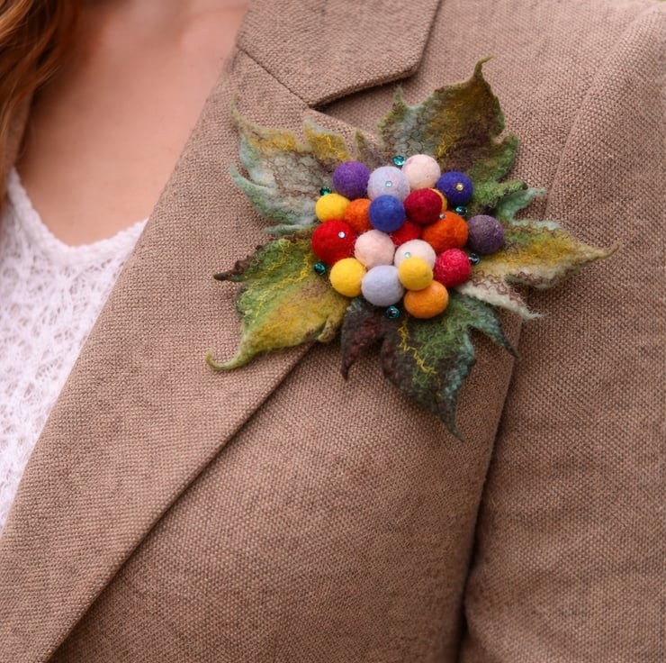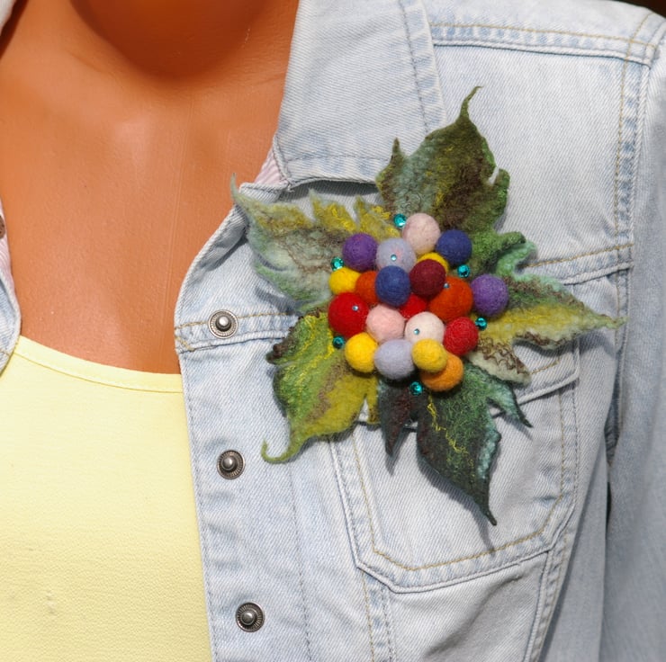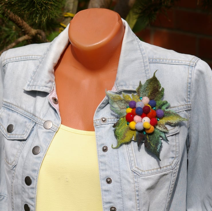 Handmade felted wool brooch created using traditional felting techniques. This unique accessory features a floral design with textured leaves and a decorative center composed of colorful felted wool balls. Each detail is carefully crafted, giving the brooch a vibrant and artistic look. Lightweight and comfortable to wear, it is perfect for decorating jackets, coats, scarves, or bags.