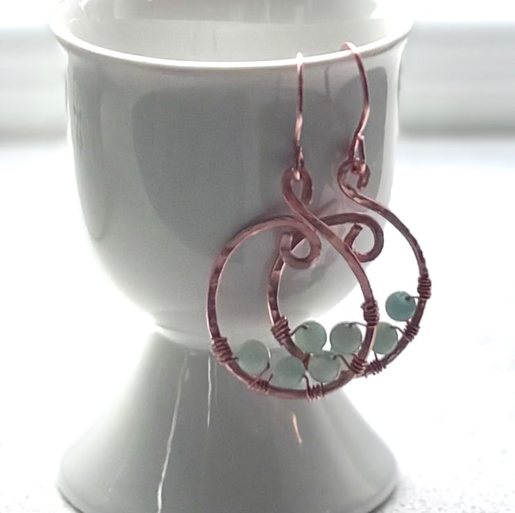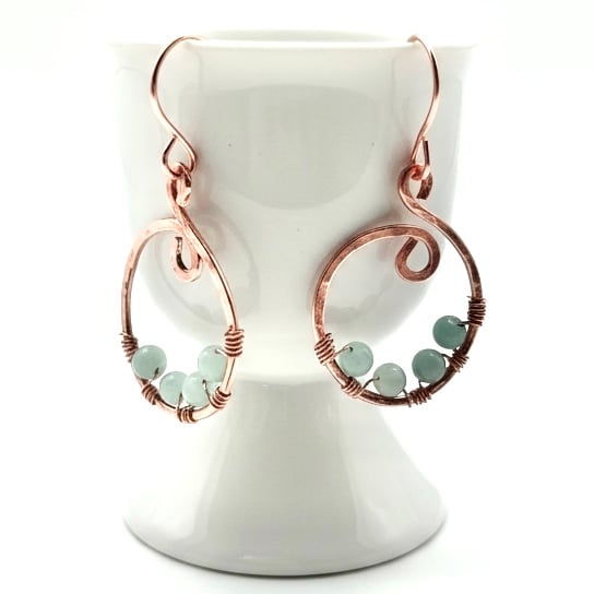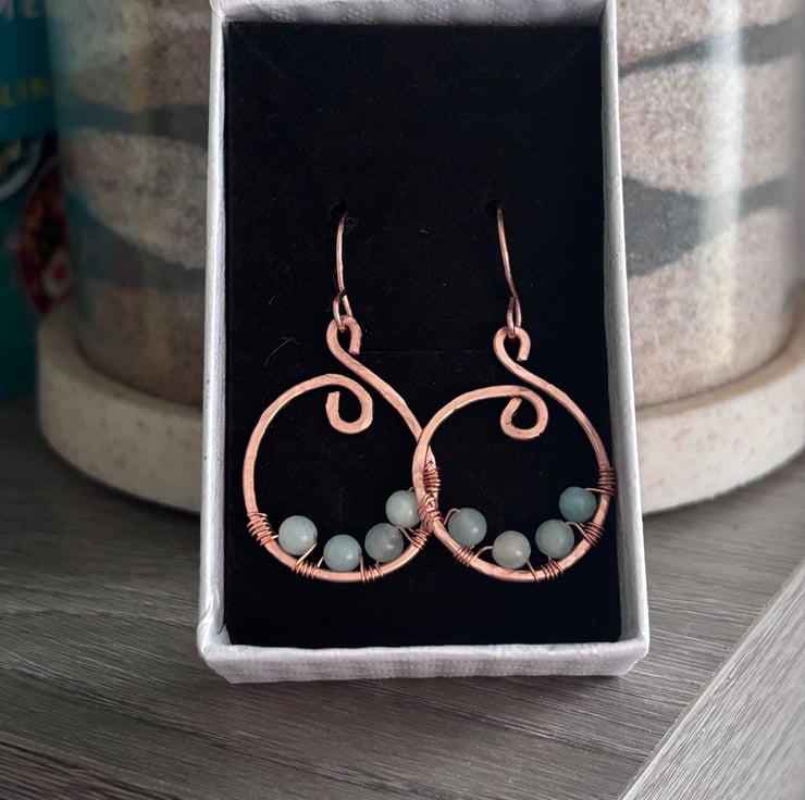 These one-of-a-kind hammered copper earrings feature elegant hand-formed curves, accented with soft 4mm Amazonite beads for a calming pop of natural beauty. Finished with handmade copper ear wires, lovingly shaped by hand, making them truly unique!