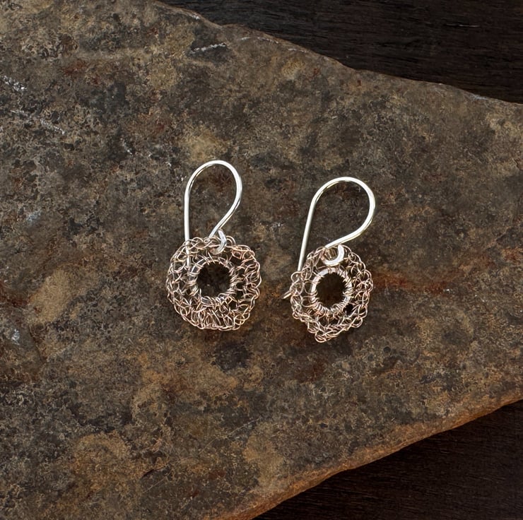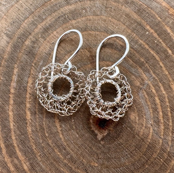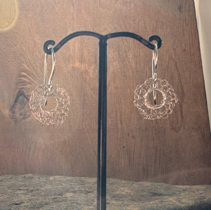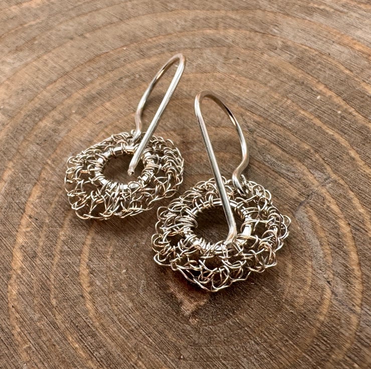 These delicate earrings are handcrafted using fine sterling silver wire, carefully crocheted stitch by stitch to create a small, intricate circular form.