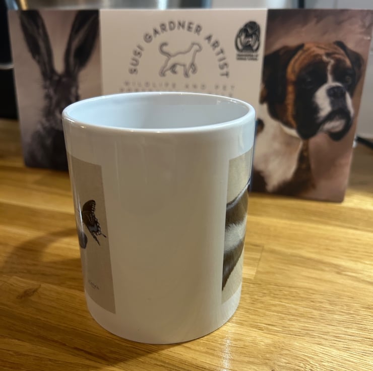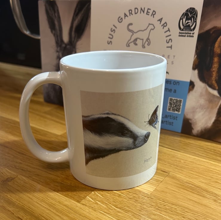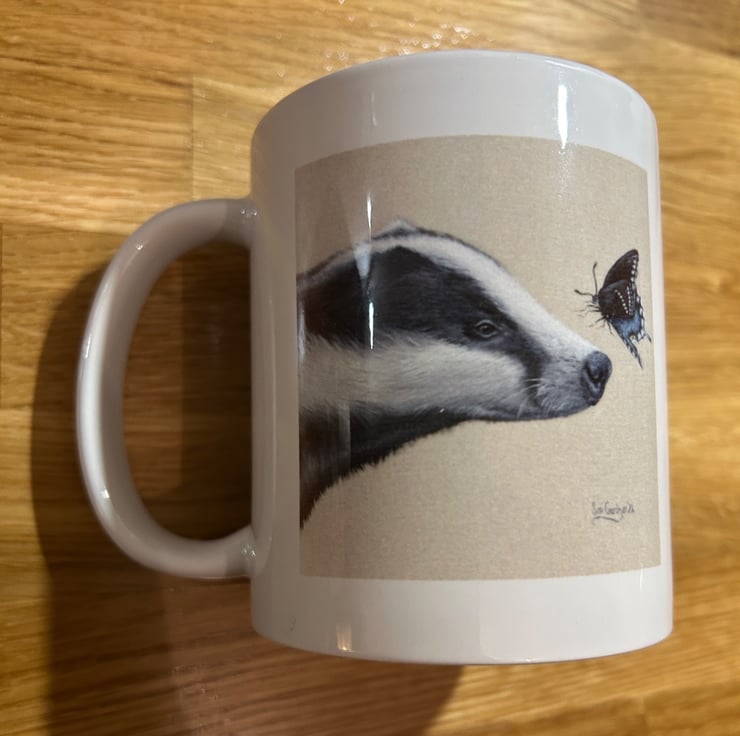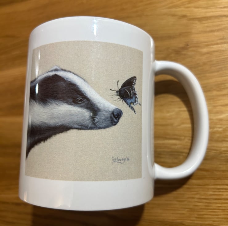 Ceramic Mug with my artwork image "Carefree" which depicts a Badger and the Butterfly enjoying spring together. The Mug has the image on each side, 9.7cm height x 8cm width (not inc handle)