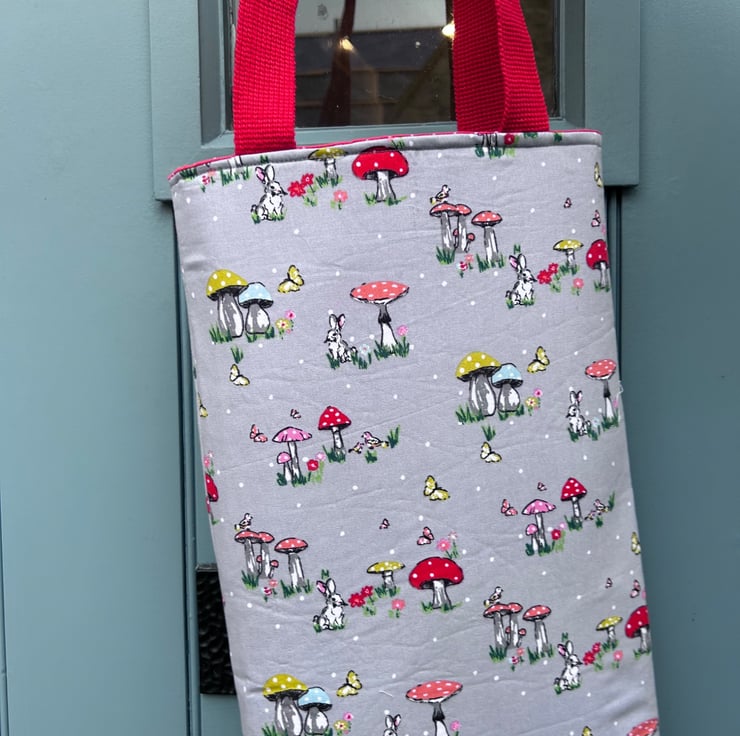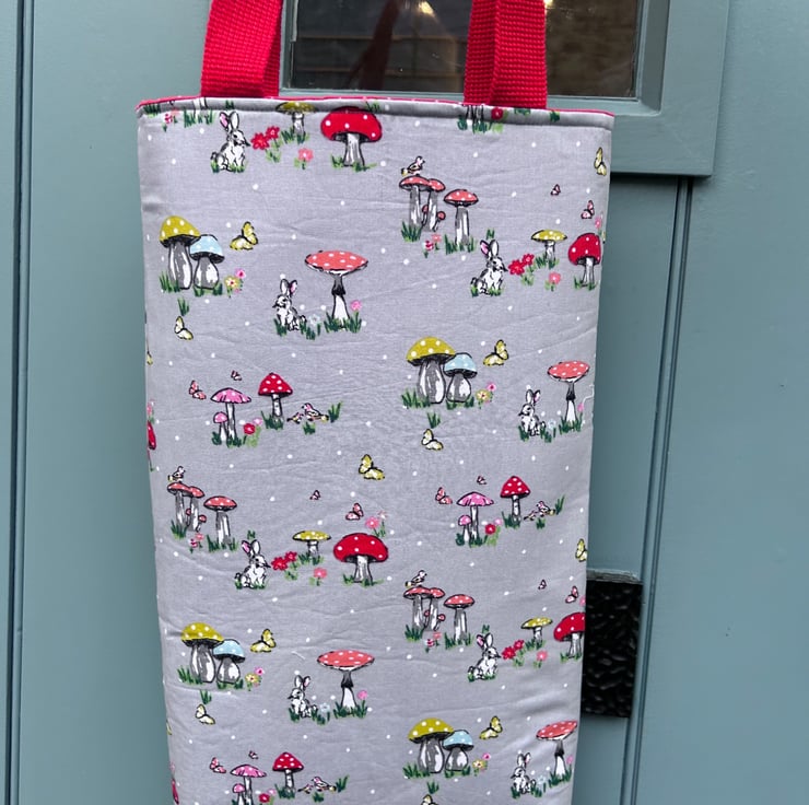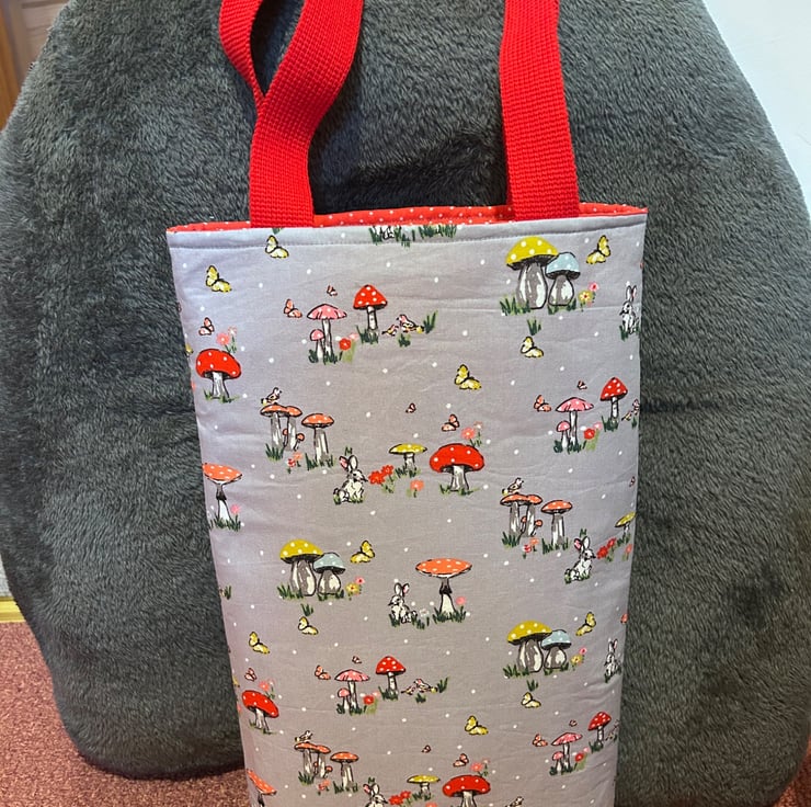 This is a long bag perfect for projects such as knitting or crochet in lovely grey and red toadstool fabric with webbing handles
