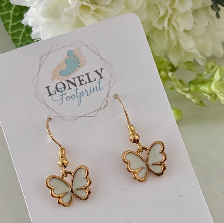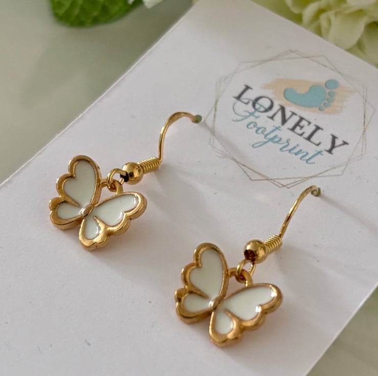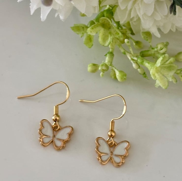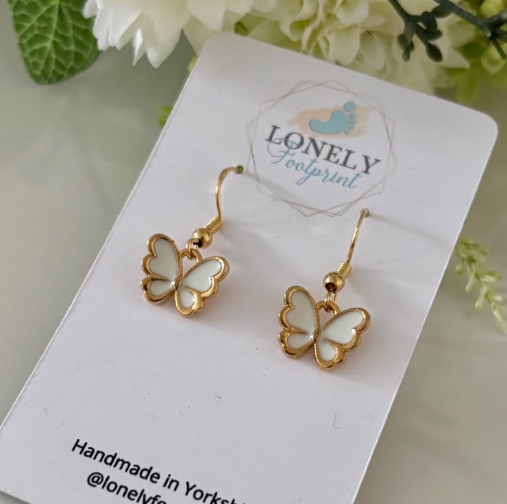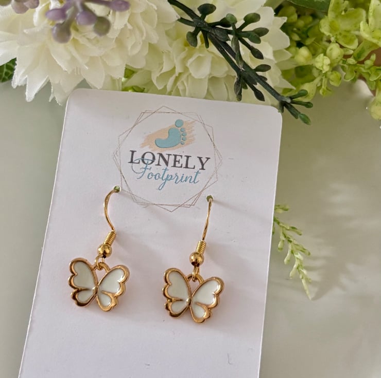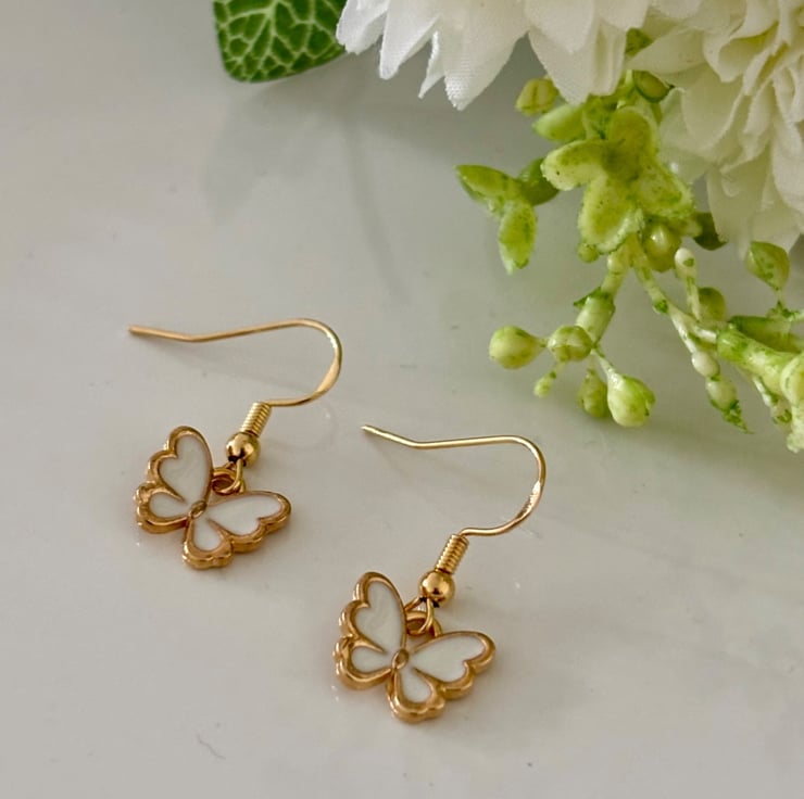 Handcrafted using gold plated hooks and butterfly charms. All earring posts, studs, hooks and hoops are lead and nickel free.
