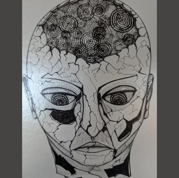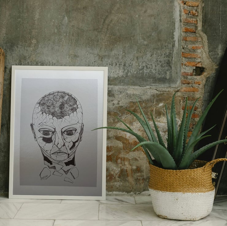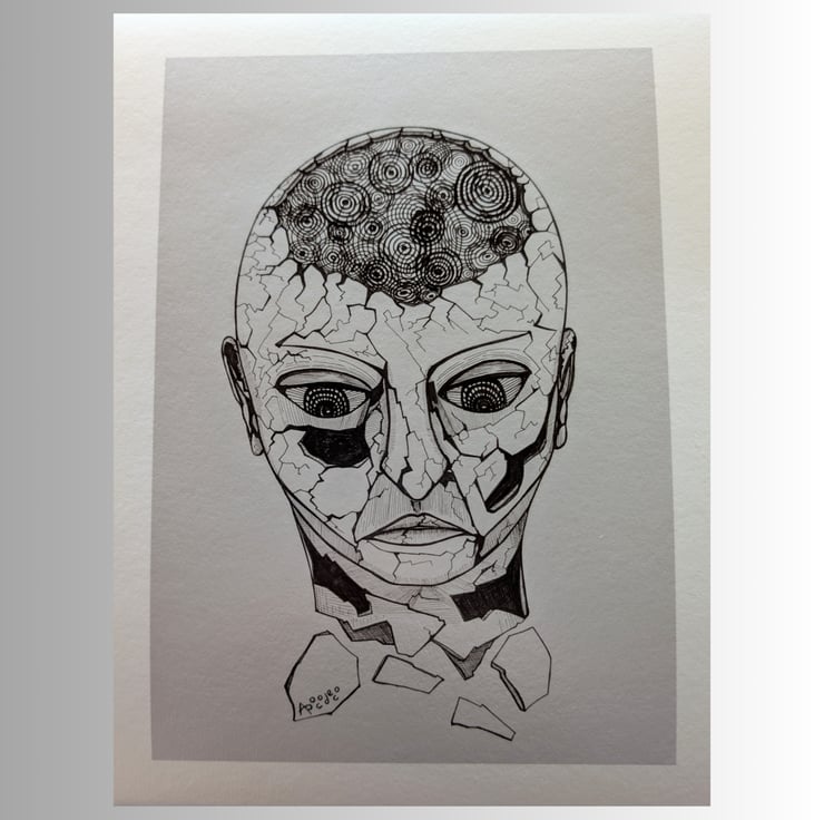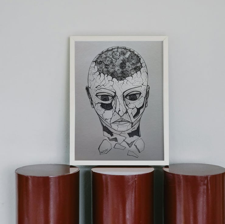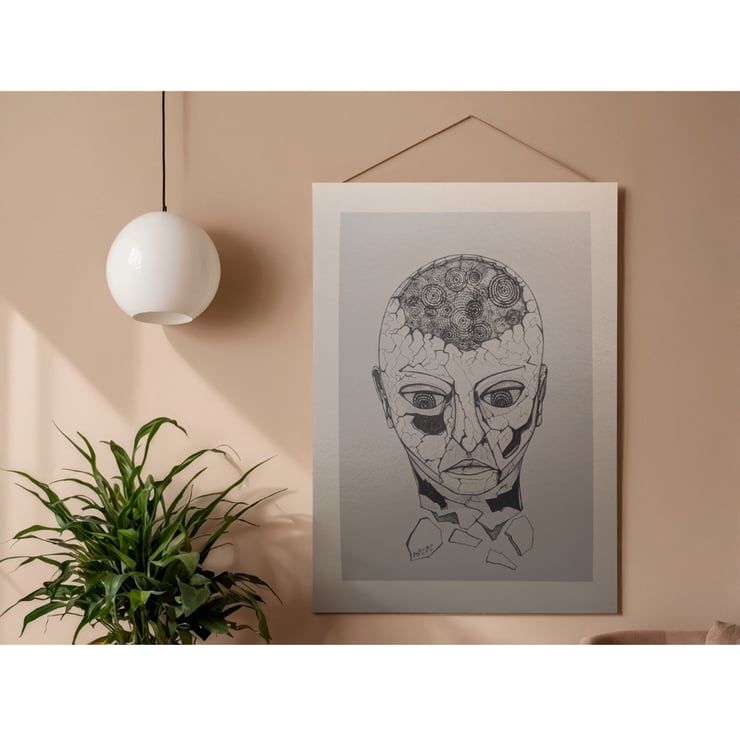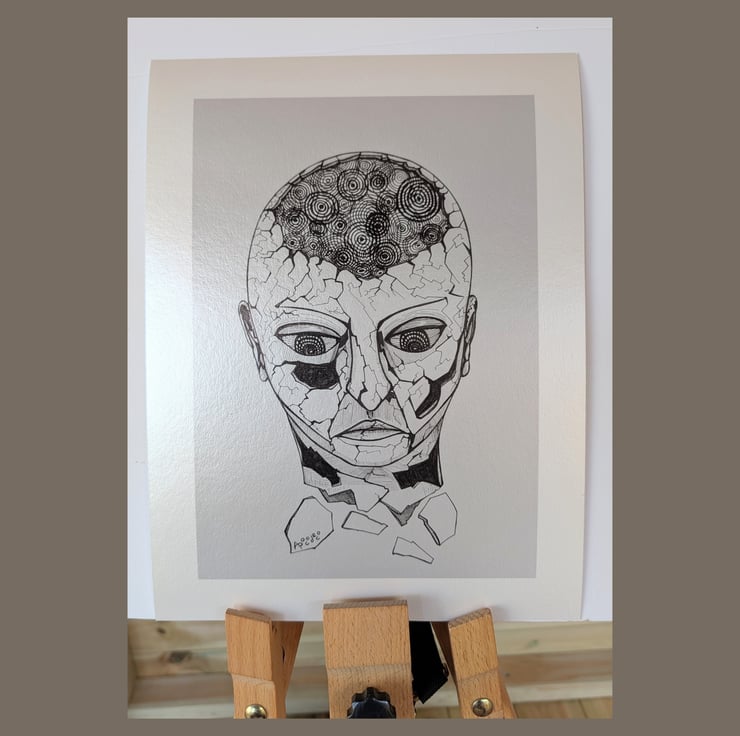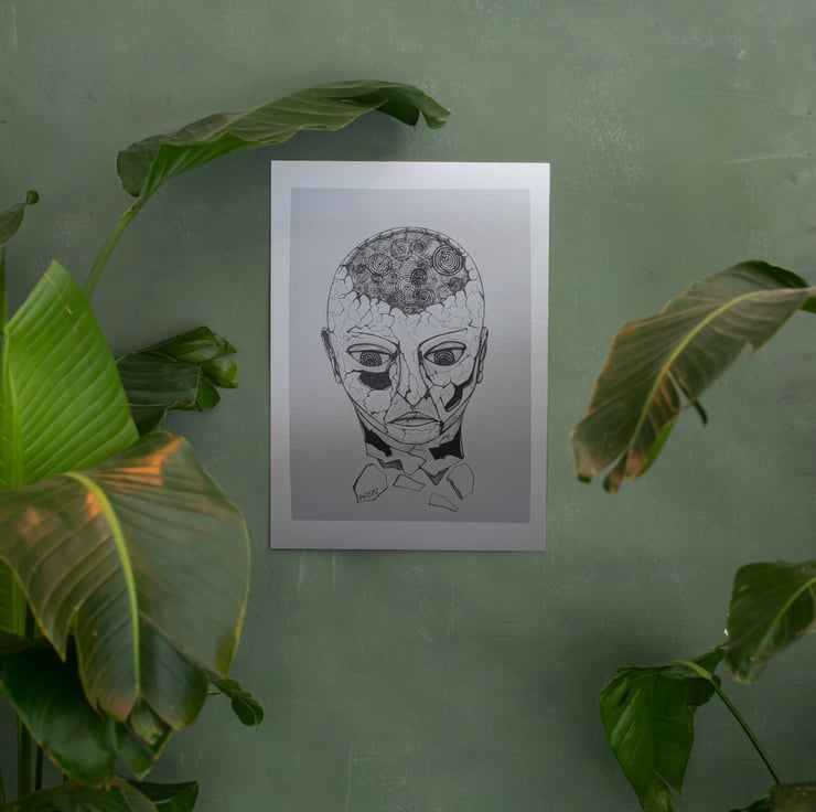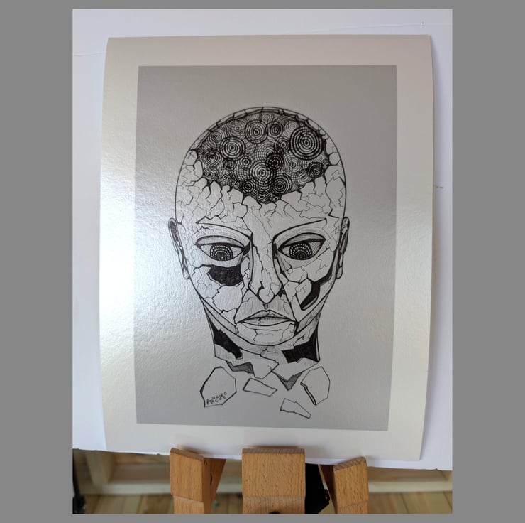 In this ink drawing, I strived to convey the day-to-day of chronic illness, especially brain fog, confusion, and the disintegration of the embodied experience. Fractured i is available here as a special limited-edition metal-effect glossy giclée print on Hahnemühle metallic photo paper background, which sets off the dark ink image with a vivid sci-fi effect. This is a small unframed print, at 235mm x 313mm, with a 25mm blank edge for optimal framing options. Fractured i silver limited edition print is a limited run of 50.