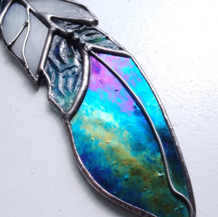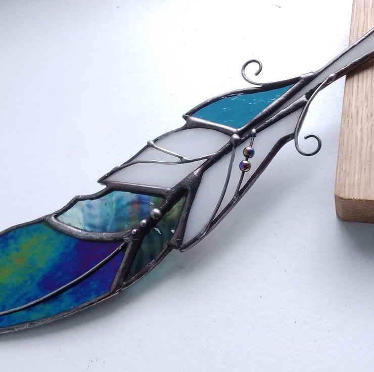 Magpie feather hand-crafted from a selection of beautiful stained glass using the Tiffany copper foil technique. Including a carefully curated mix of the highest quality wispy and textured fine art glass and finished with brushed pewter solder and wirework details. Ready to hang.