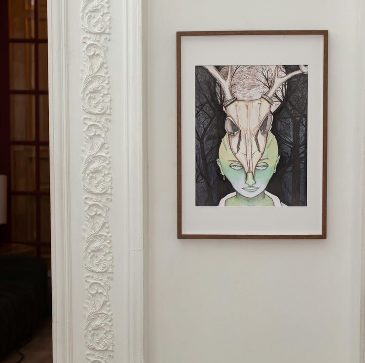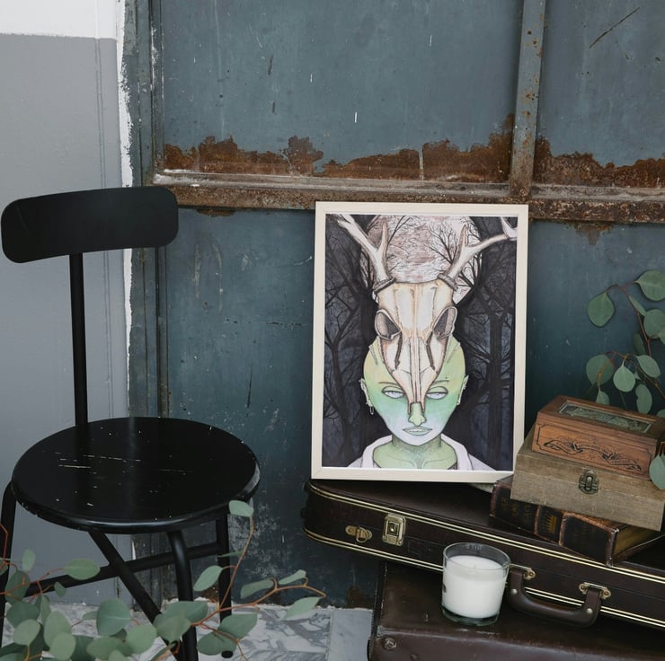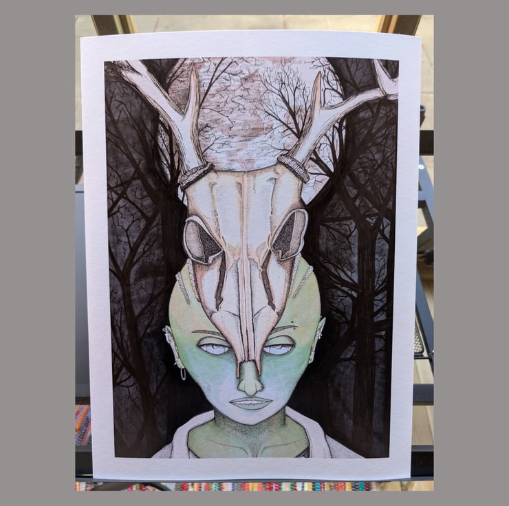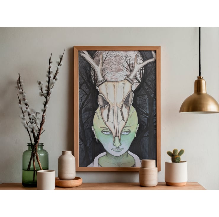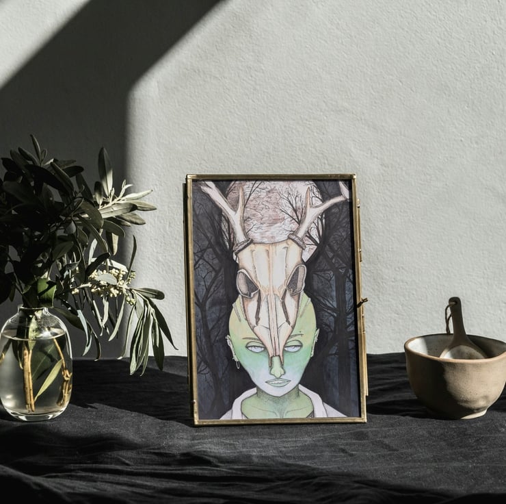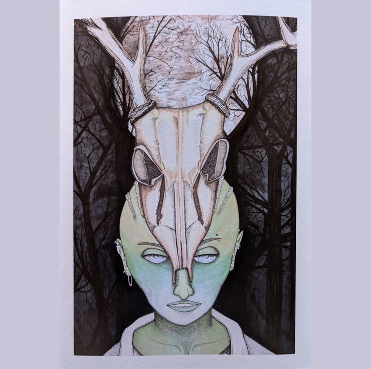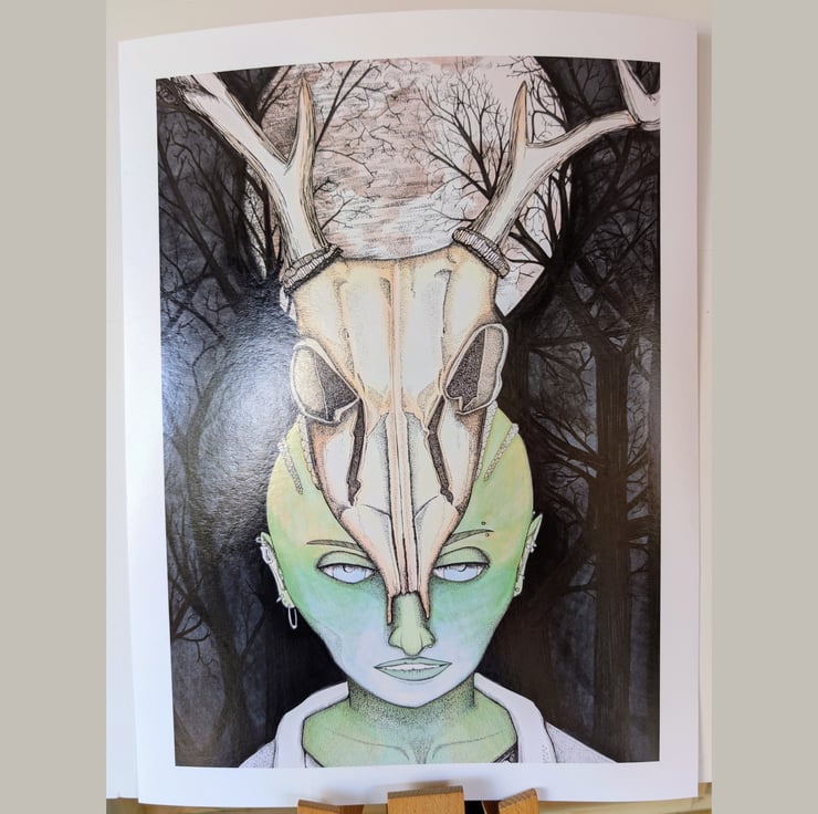 Inspired by the legend of Herne the Hunter, I was endeavouring to create a modern ghostly take, with an androgynous Herne with great antlers against the backdrop of a dark forest and the full moon. From an original in ink, this giclée fine art print is rendered in dramatic contrast on glossy Hahnemühle Fine Art Baryta paper. Ideal for fans of the witchy, the mythological, and dark art, the print is 347mm x 471mm with a 25mm border for optimal framing options, and looks great on a bedroom or living room wall. Herne the Hunter is a limited edition run of 100.