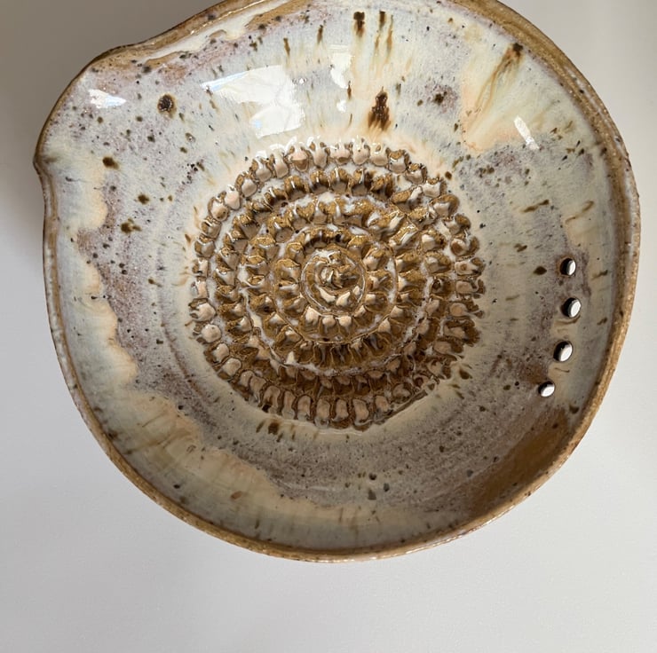 This handy yet beautiful little bowl is great for grating garlic and stripping herb all in one sauce bowl. It also has a pouring spout. Great for sauces and dressings and looks good on your table too.