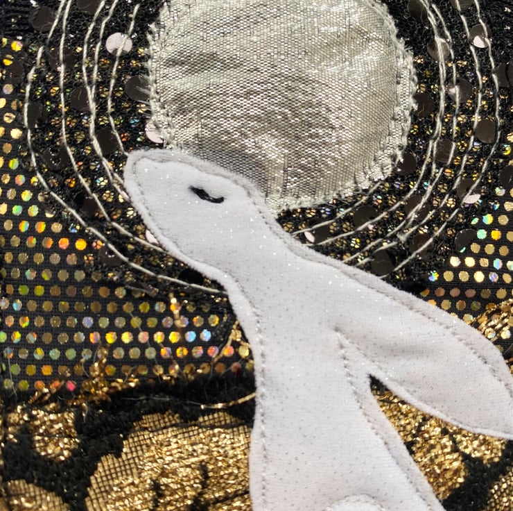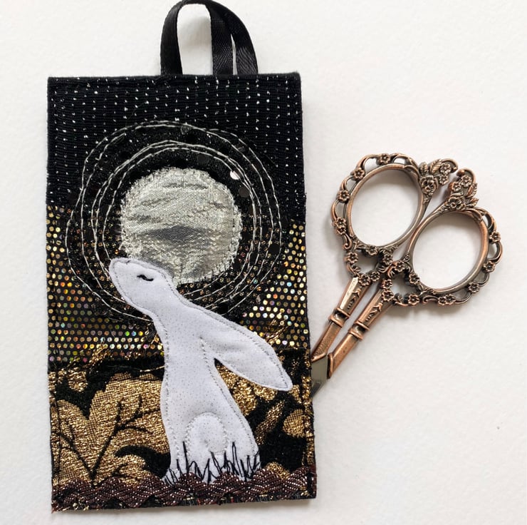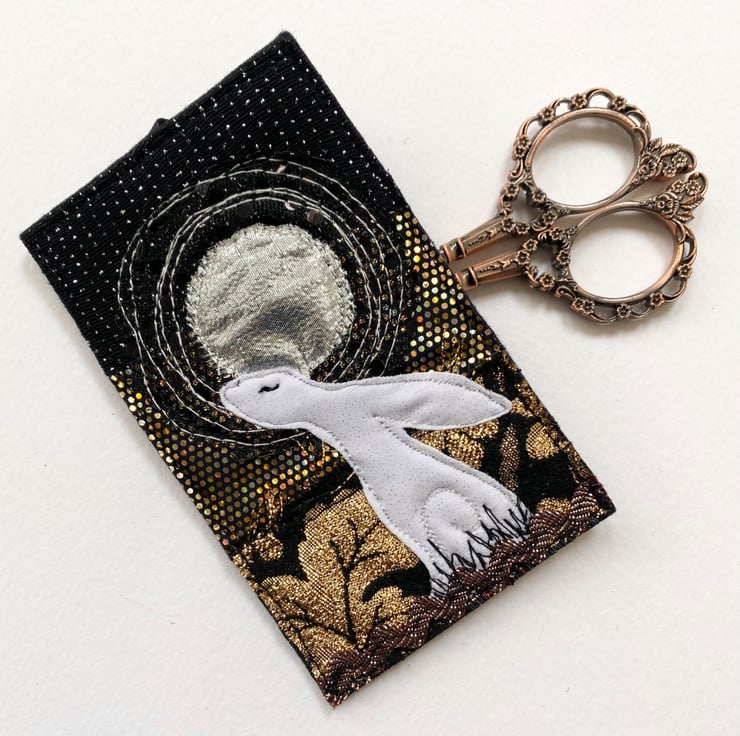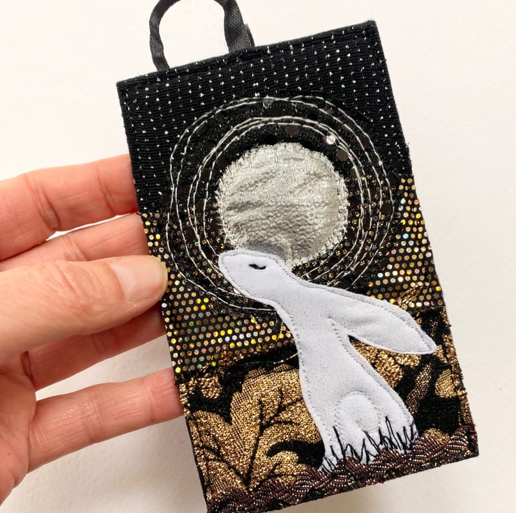 This beautiful embroidered hare home decorations shows a hare gazing at the full moon. It has been made from up-cycled fabrics and stitched down with free motion embroidery. It comes felt backed and measure approx 7.5 x 12.5cm, with the ribbon the length is 22.5cm.