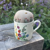 Cute little pincushion in a vintage egg cup. The rabbit egg cup holds a reclaimed linen cushion which has been embroidered with tiny flowers and a bee.