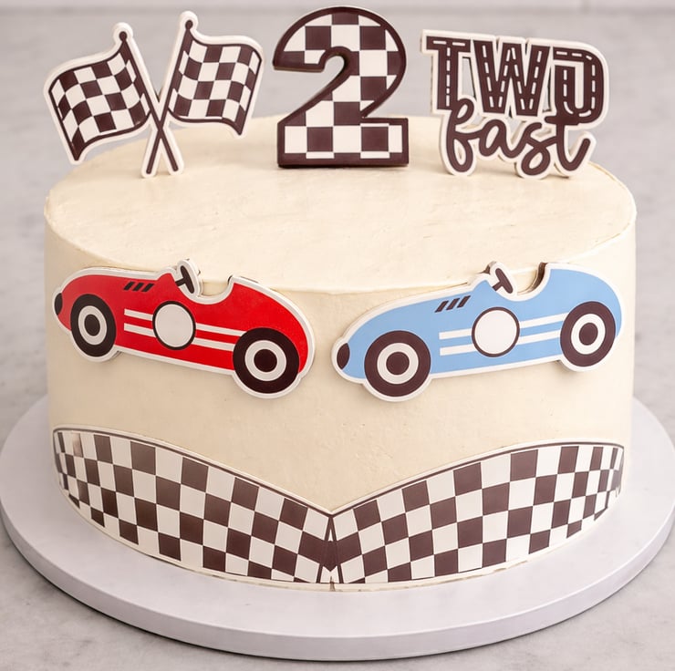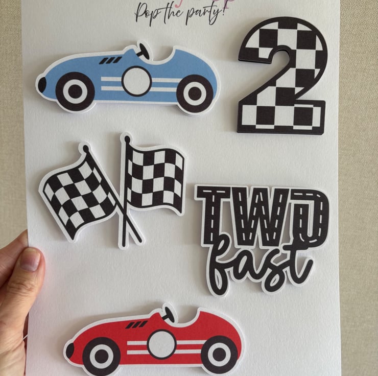 Throw a special birthday party with this lovely Two Fast themed cake accessory pack.