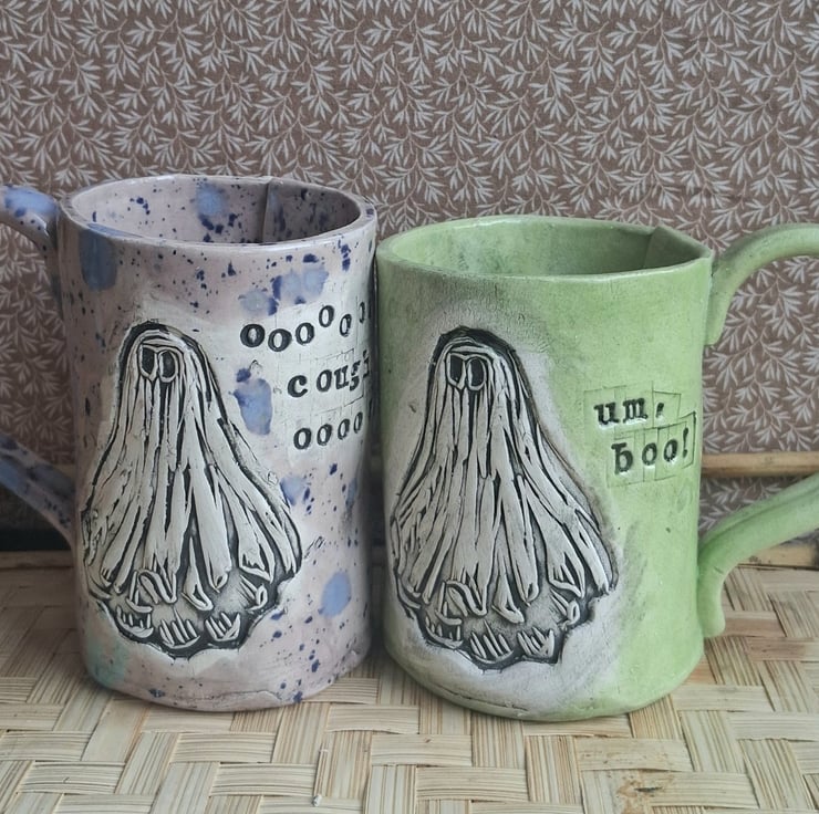 Dave the ghost coffee mug ceramic pottery tea cup, stoneware handmade,purple berry or lime green, custom, bespoke,