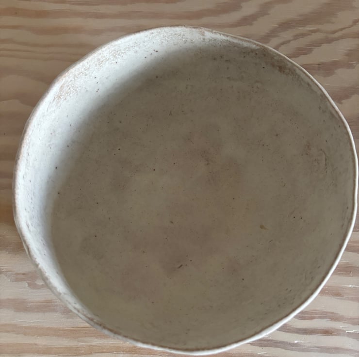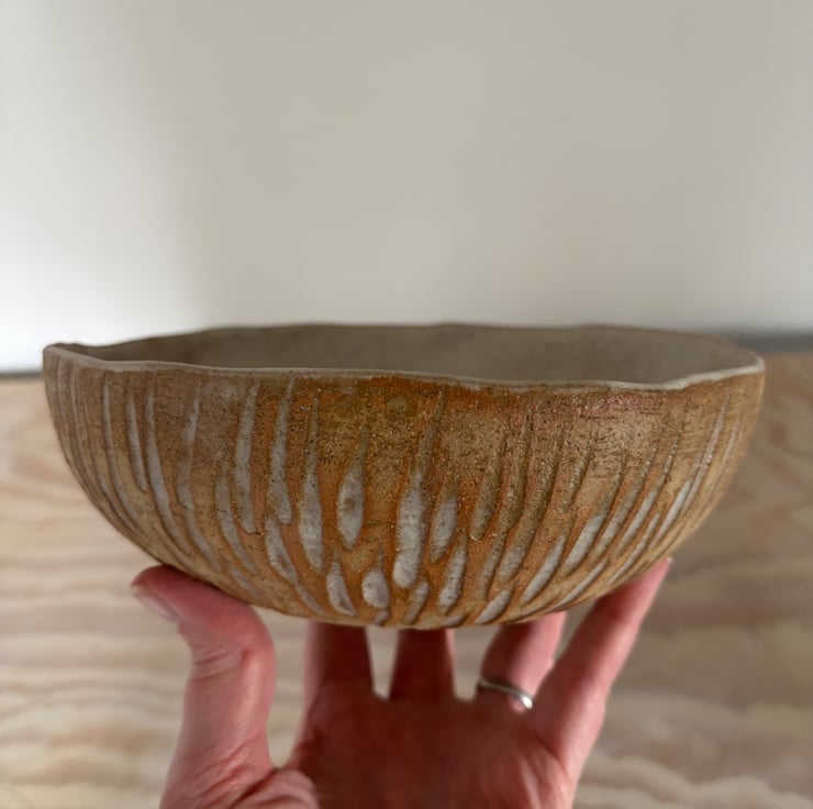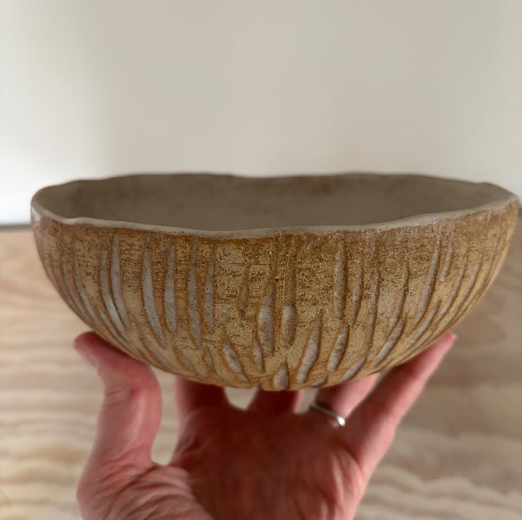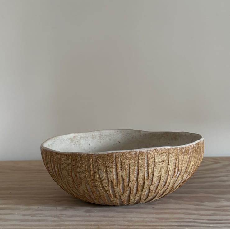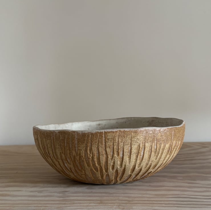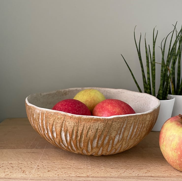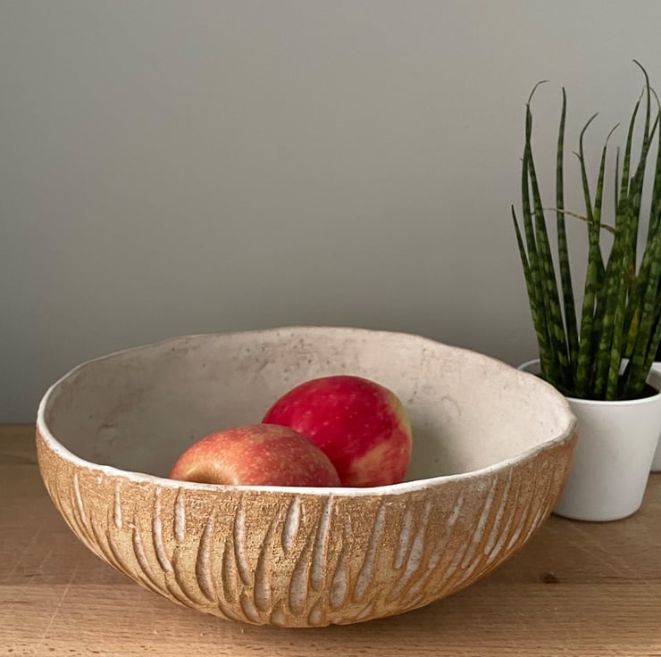Beautiful handmade rustic ceramic fruit bowl. This textured bowl is entirely hand built using hand rolled coils to create the shape. It has then been carved on the outside to create a pattern which is enhanced by the natural cream glaze. The inside has been glazed with the same cream glaze.