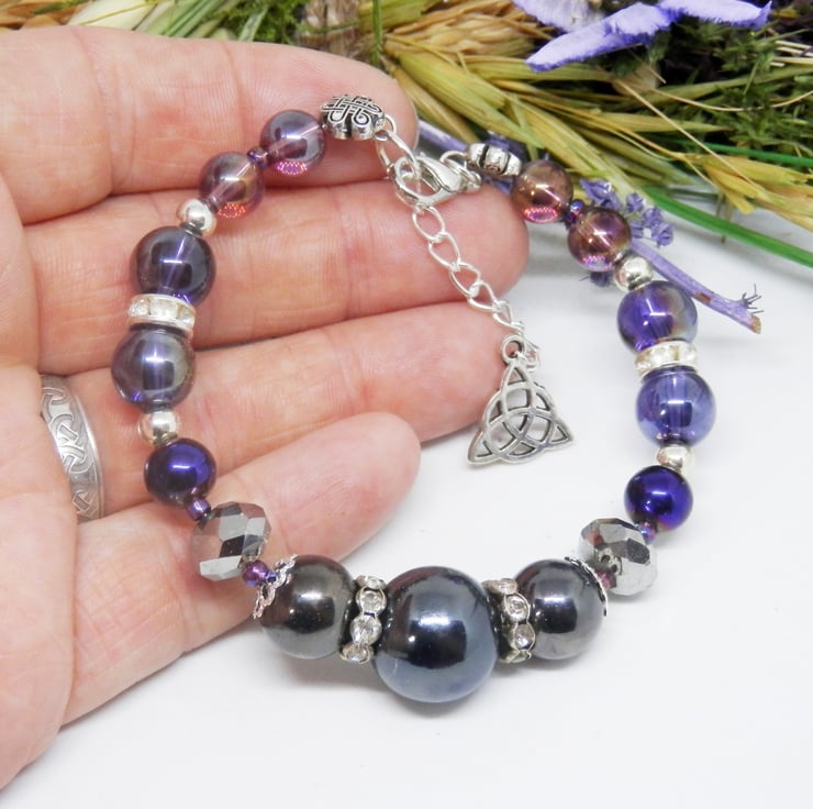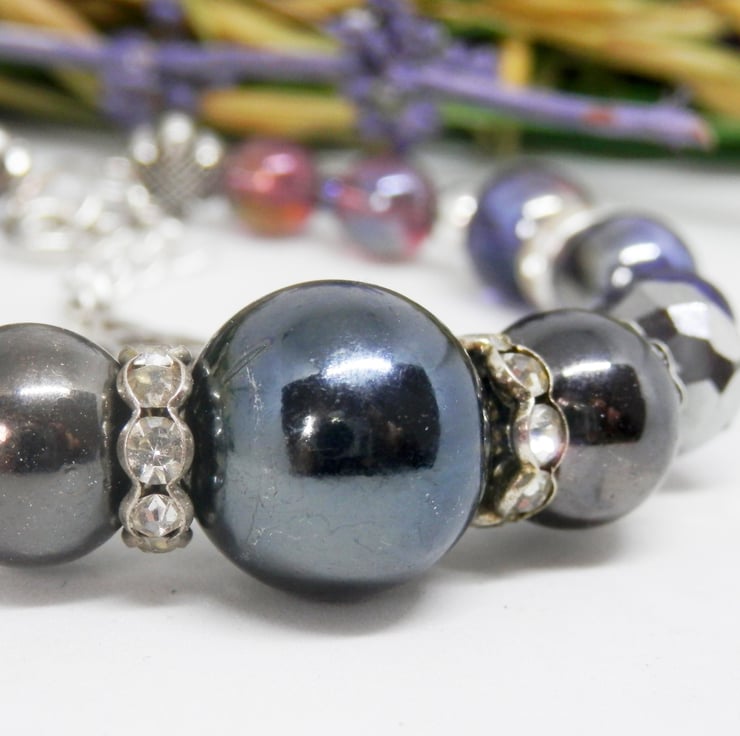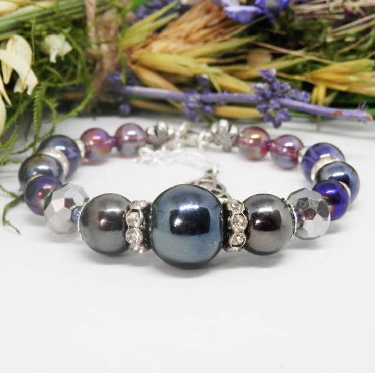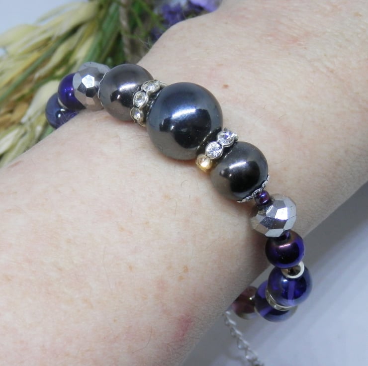 Here we have a fabulous Memory Wire Bracelet made using silver plated Memory Wire that holds it's shape. Adorned with lots of Electroplated beads, faceted beads, diamante spacers and silver plated spacer beads.