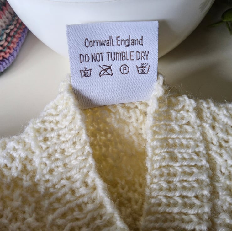 Baby knitwear is designed and hand crafted by Demelza Designs in Cornwall meeting UK baby safety standards, Only branded premuim acylic, acrylic/natural fibre blends or pure natural fibre yarns are used in baby knitwear which conforms to BS984/76 standards.