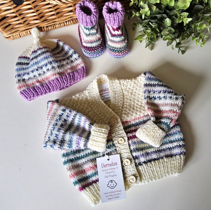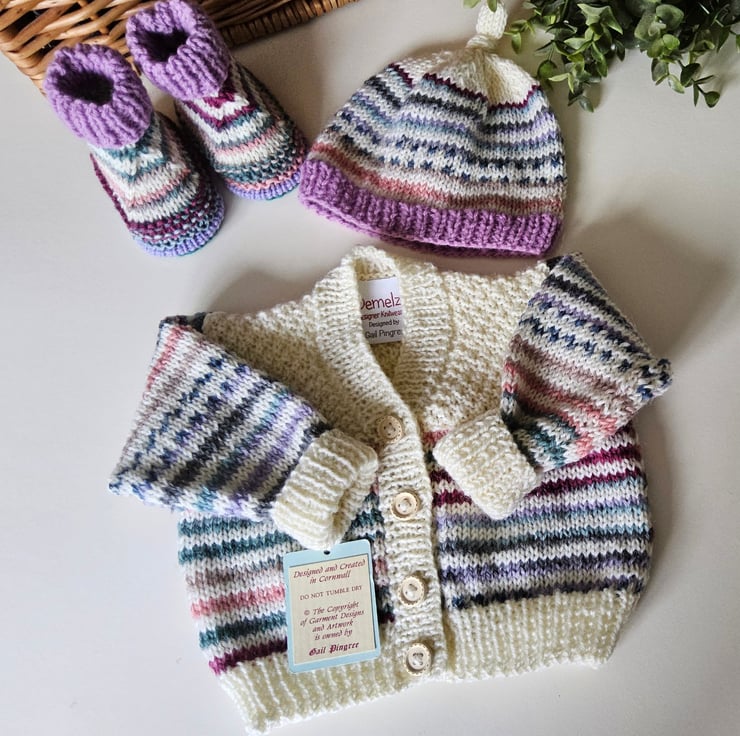 This cosy warm hand knitted super soft baby cardigan, booties and hat set has been lovingly designed and hand crafted in Cornwall using cream 'Jeager' pure merino wool yarn complimented with a pure merino wool multicoloured and pink yarns. All yarns are machine washable at low temperature settings. Merino wool is completely natural and has the advantage of being able to regulate body heat. This allows a baby's skin to breath naturally.