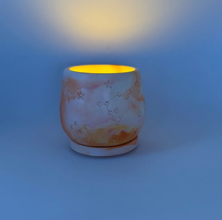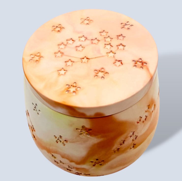 The softly rounded body and flat circular lid are both detailed with delicate stars and constellation motifs, giving the piece an extra celestial touch.