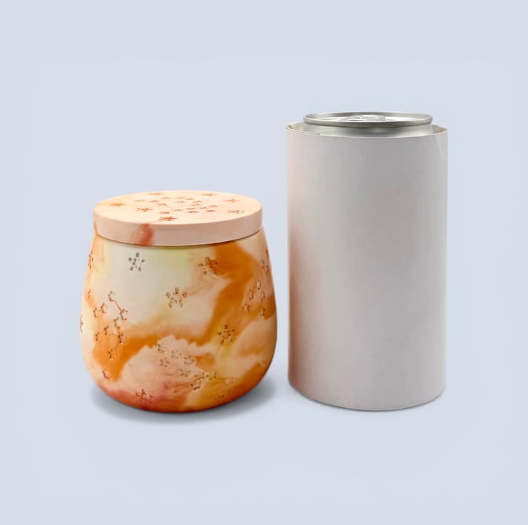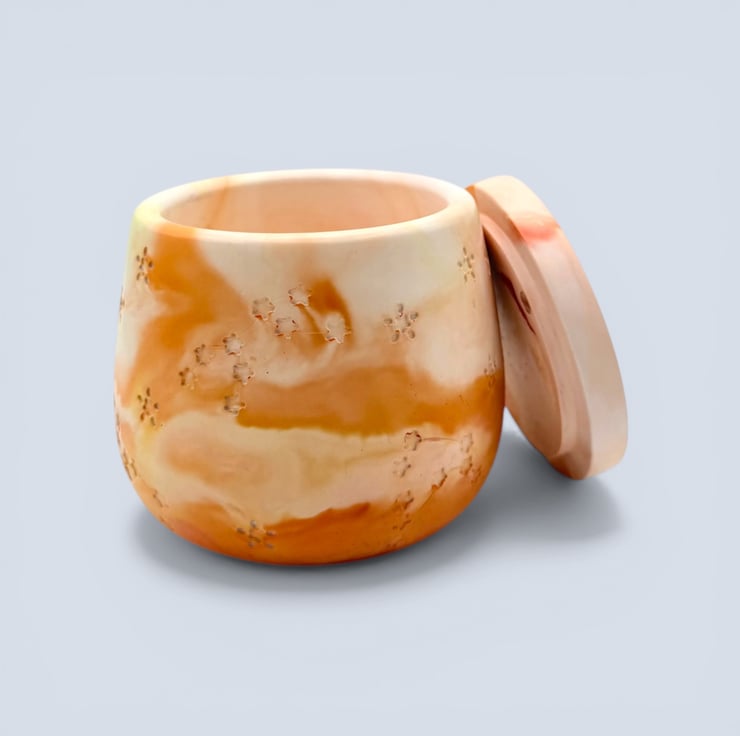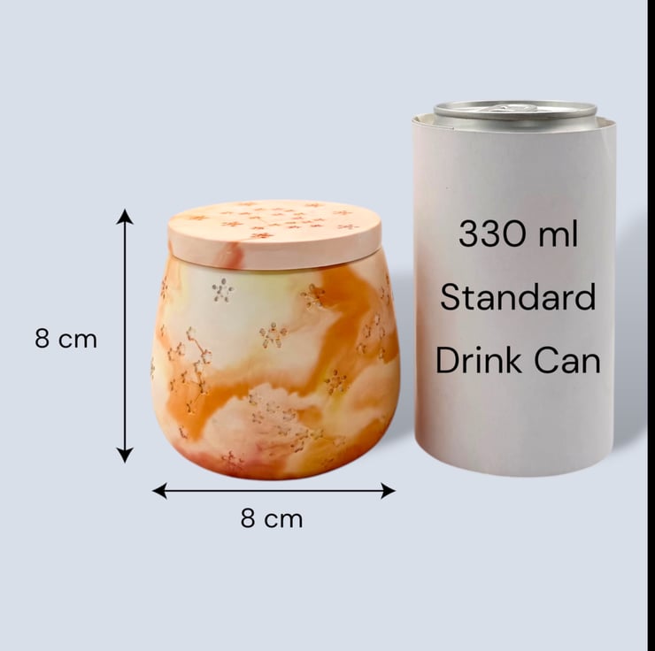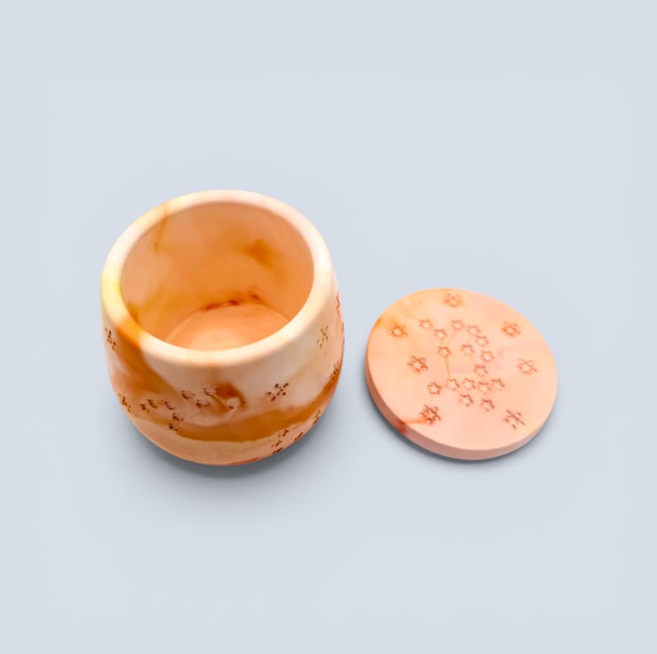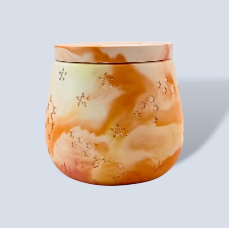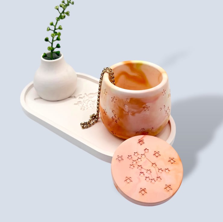 Sunrise marbled jewellery box in warm peach, apricot, soft orange and cream tones with recessed star and constellation detailing. This small handmade jewellery box is ideal for storing rings, earrings and tiny keepsakes, and it makes a lovely gift for jewellery lovers, birthdays, housewarmings or anyone who enjoys colourful handmade home decor. Inspired by the warmth of early morning light, the marbled pattern flows around the softly rounded body in one of a kind swirls that feel bright, uplifting and decorative.