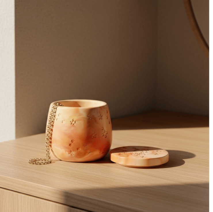 It feels like a celebration of new beginnings, warmth and possibility, making it a meaningful place to store the small treasures that matter most.
