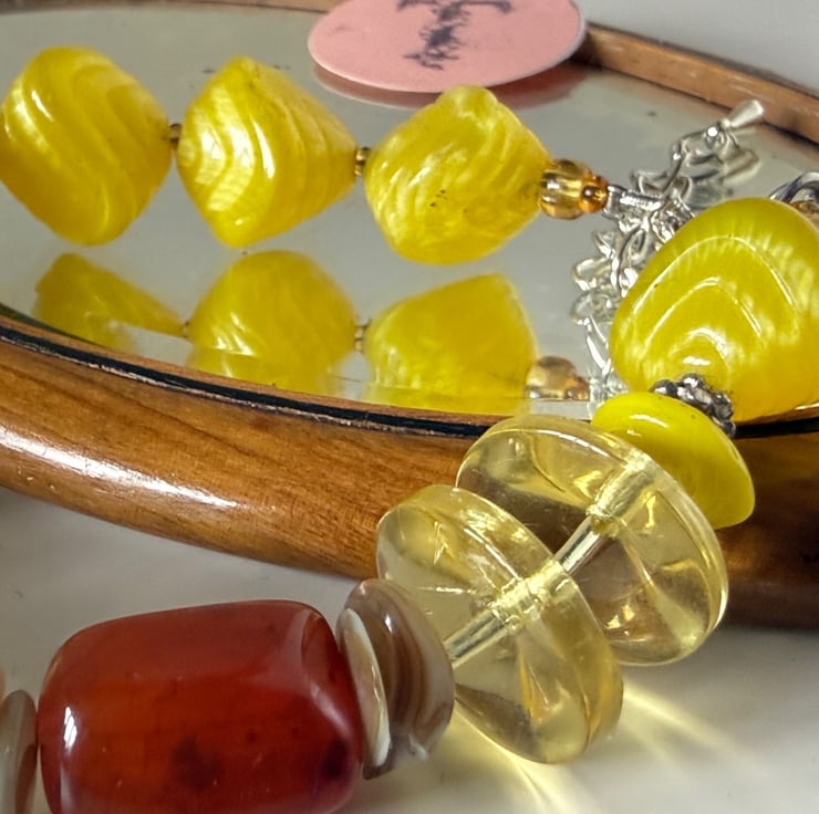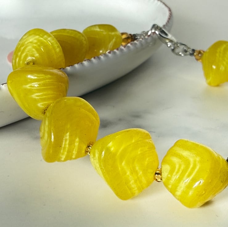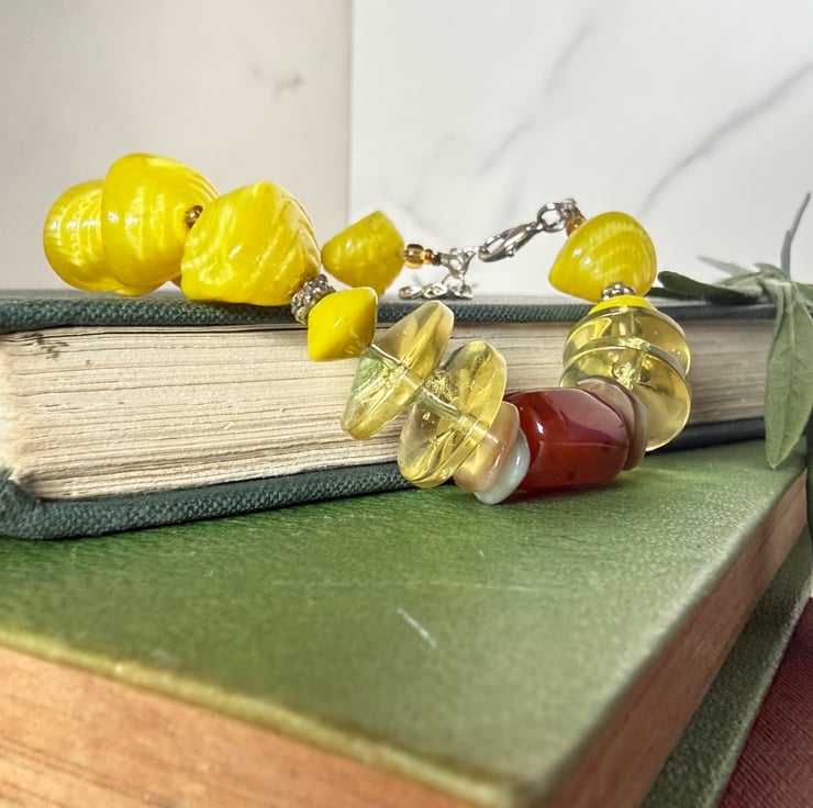 This joyously bright yellow bracelet features both modern and vintage glass bead finds. The vintage beads are the curiously shaped and slightly ribbed bright yellow ones. I think possibly from the 1950's or 60's.