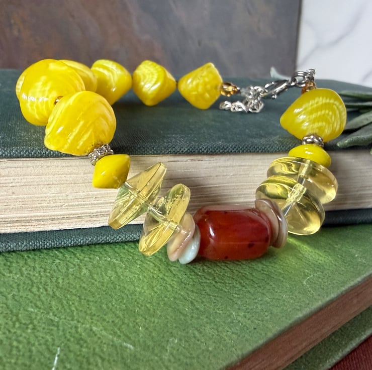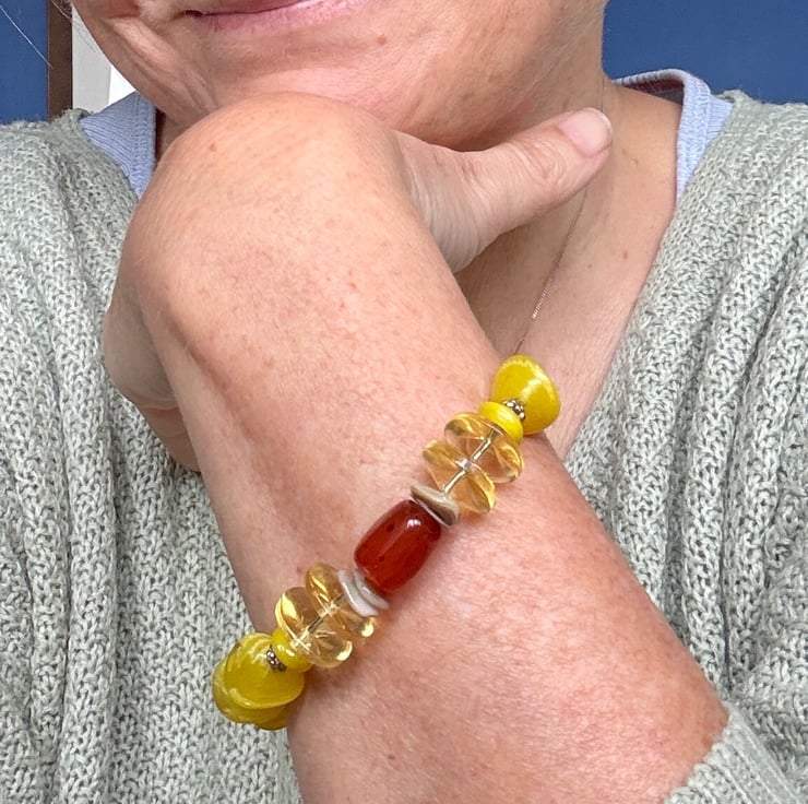 To bring further interest to this original and unique piece there are some modern beads with contrasting shapes that appear closer to one end of the bracelet. The whole piece brings colour and shape and fun and will be an absolute joy to wear with any of your outfits. Whether that outfit is jeans and a tee or a fabulous summer dress it will look great.