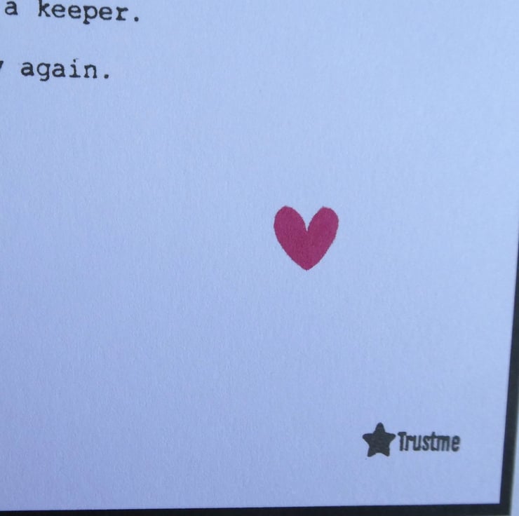 The design has been finished with a hand stamped red heart for a pop of colour and a 'logo' with a star and the word Trustme.
