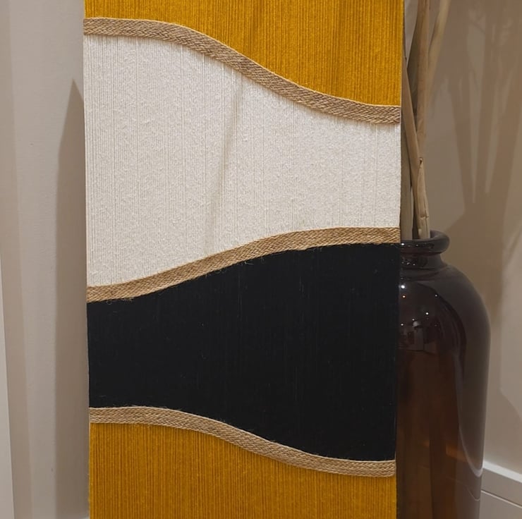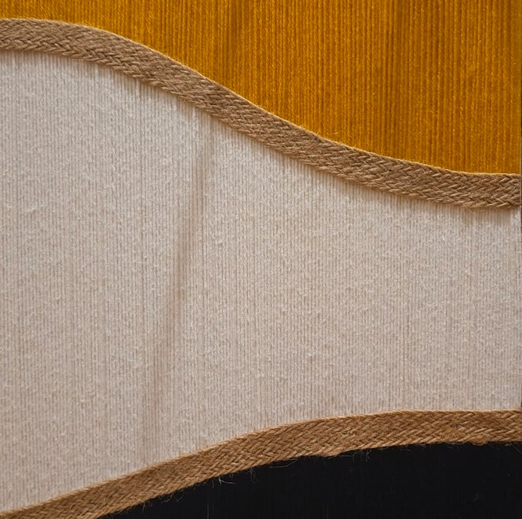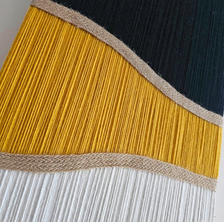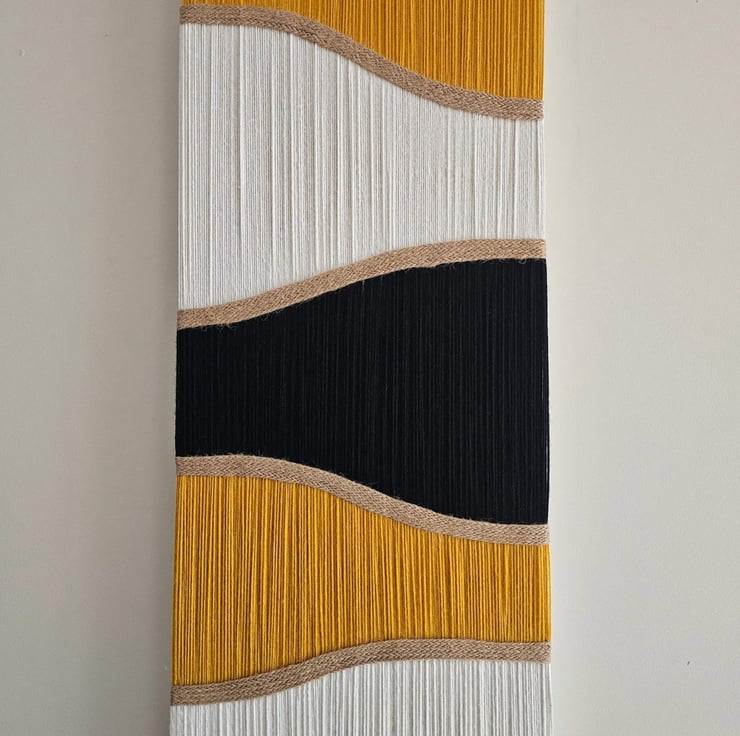 A refined balance of warmth and depth, Warm Contrast is a handwoven textile artwork that explores harmony through opposites. Rich mustard tones meet soft ivory and deep black, creating a bold yet calming visual rhythm.